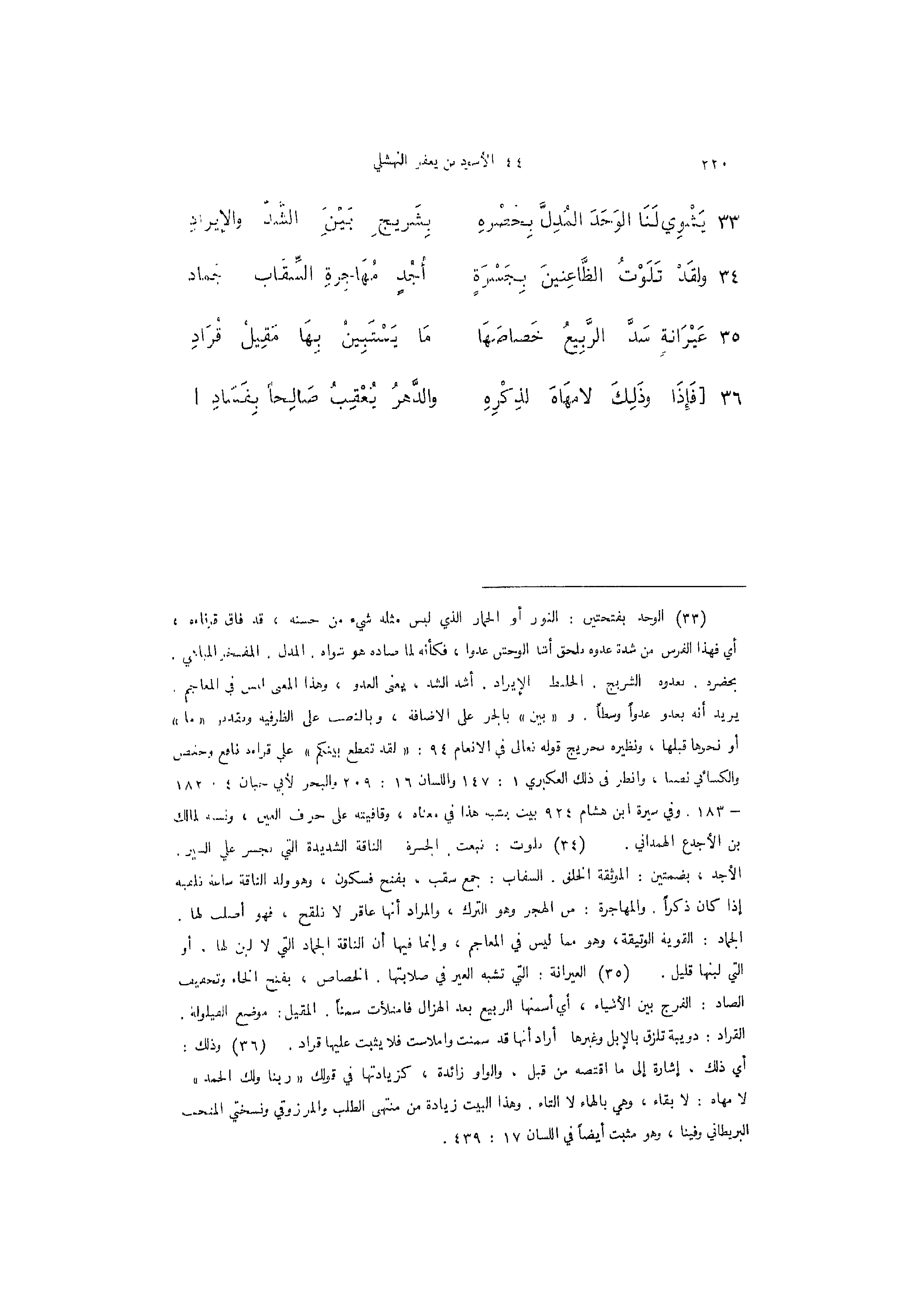 33 - (يَشْوِي لَنَا الوَحَدَ المُدِلَّ بِحُضْرِهِ ... بِشَريجِ بَيْنَ الشَّدَّ والإِيرَادِ)