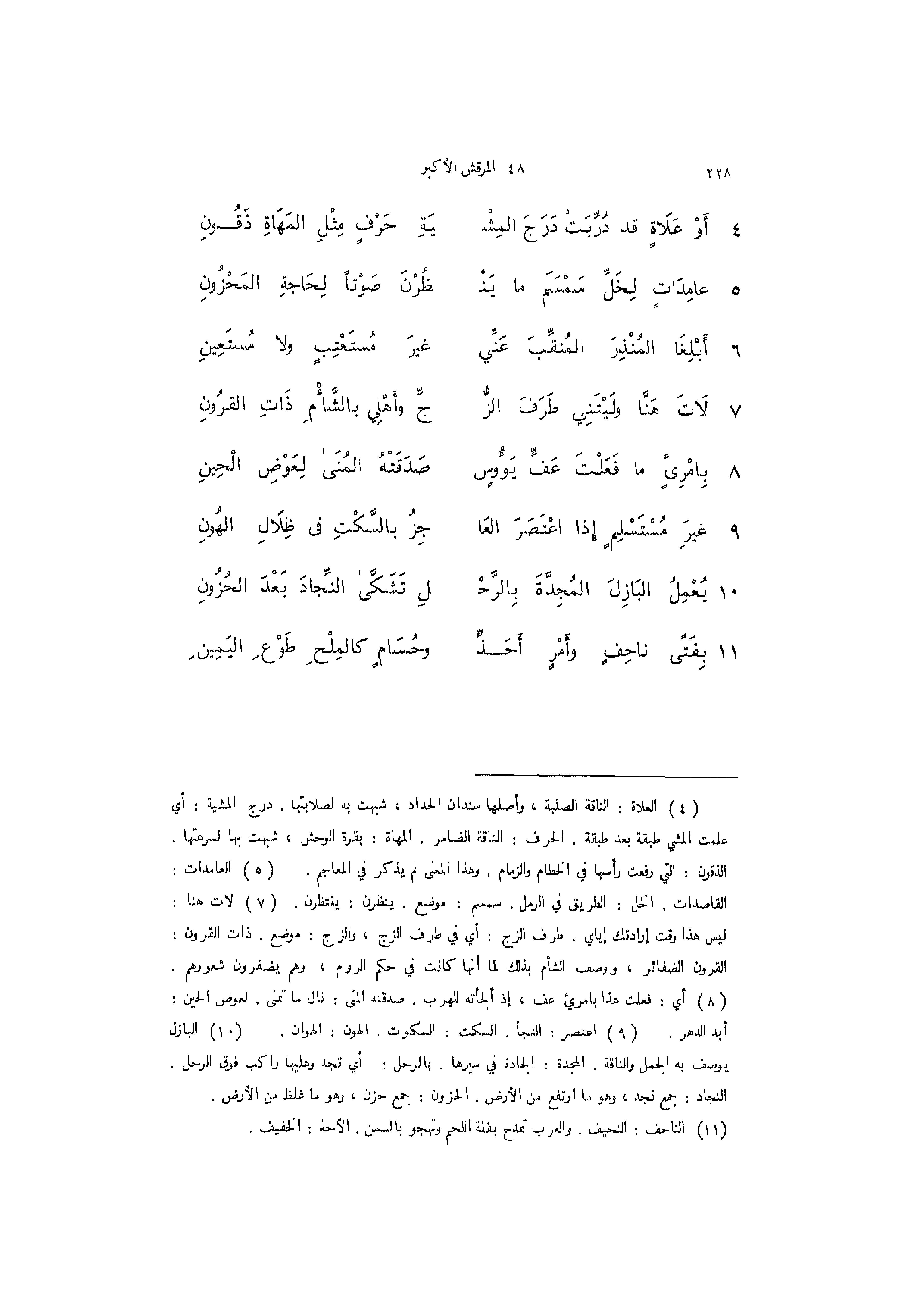 10 - (يُعْمِلُ البَازِلَ المجدة بالرحل ... تَشَكَّى النِّجادَ بَعْدَ الحُزُونِ)