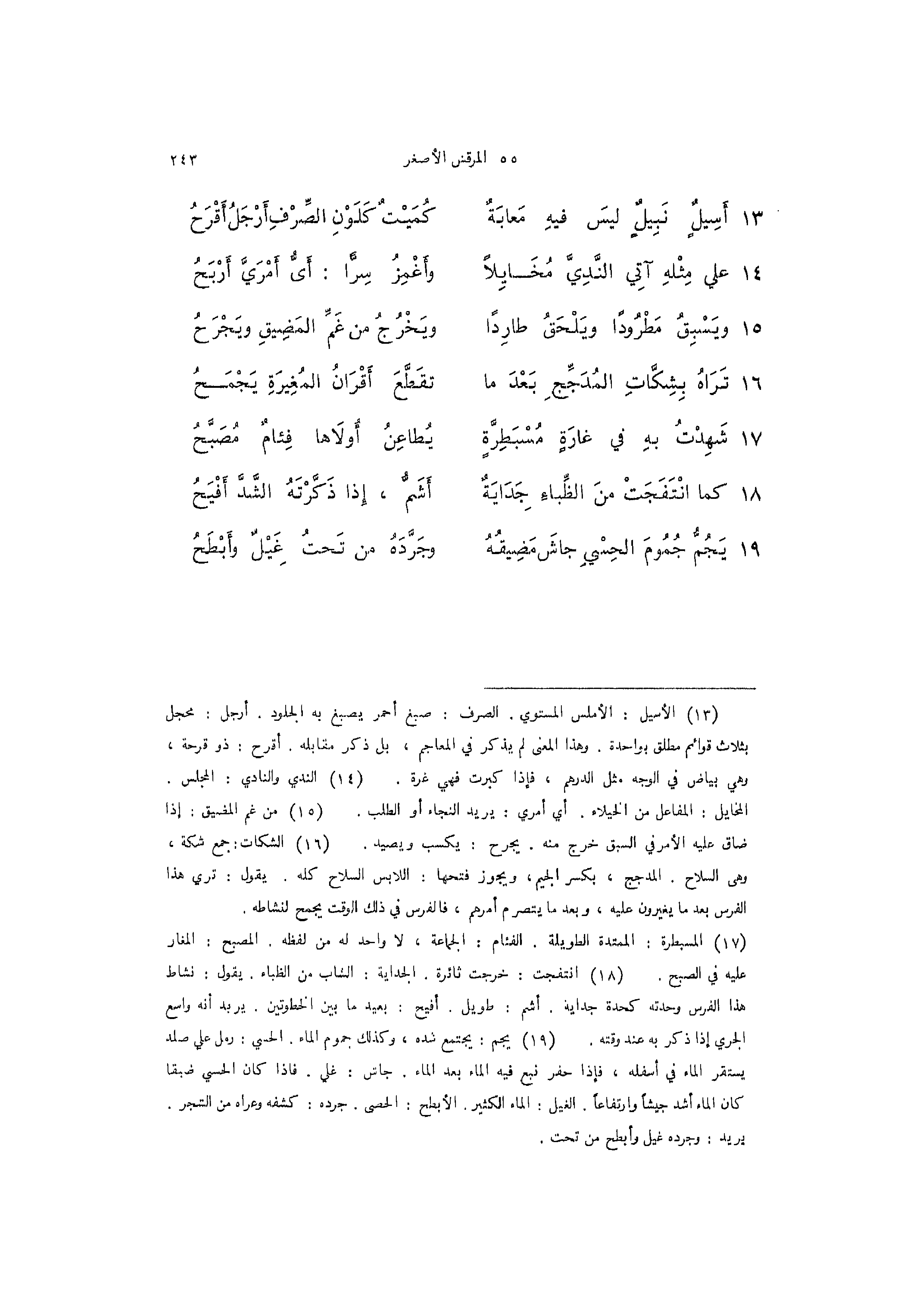 13 - (أَسِيلٌ نَبِيلٌ ليسَ فيهِ مَعابَةٌ ... كُمَيْتٌ كَلَوْنِ الصِّرْفِ أَرْجَلُ أَقْرَحُ)