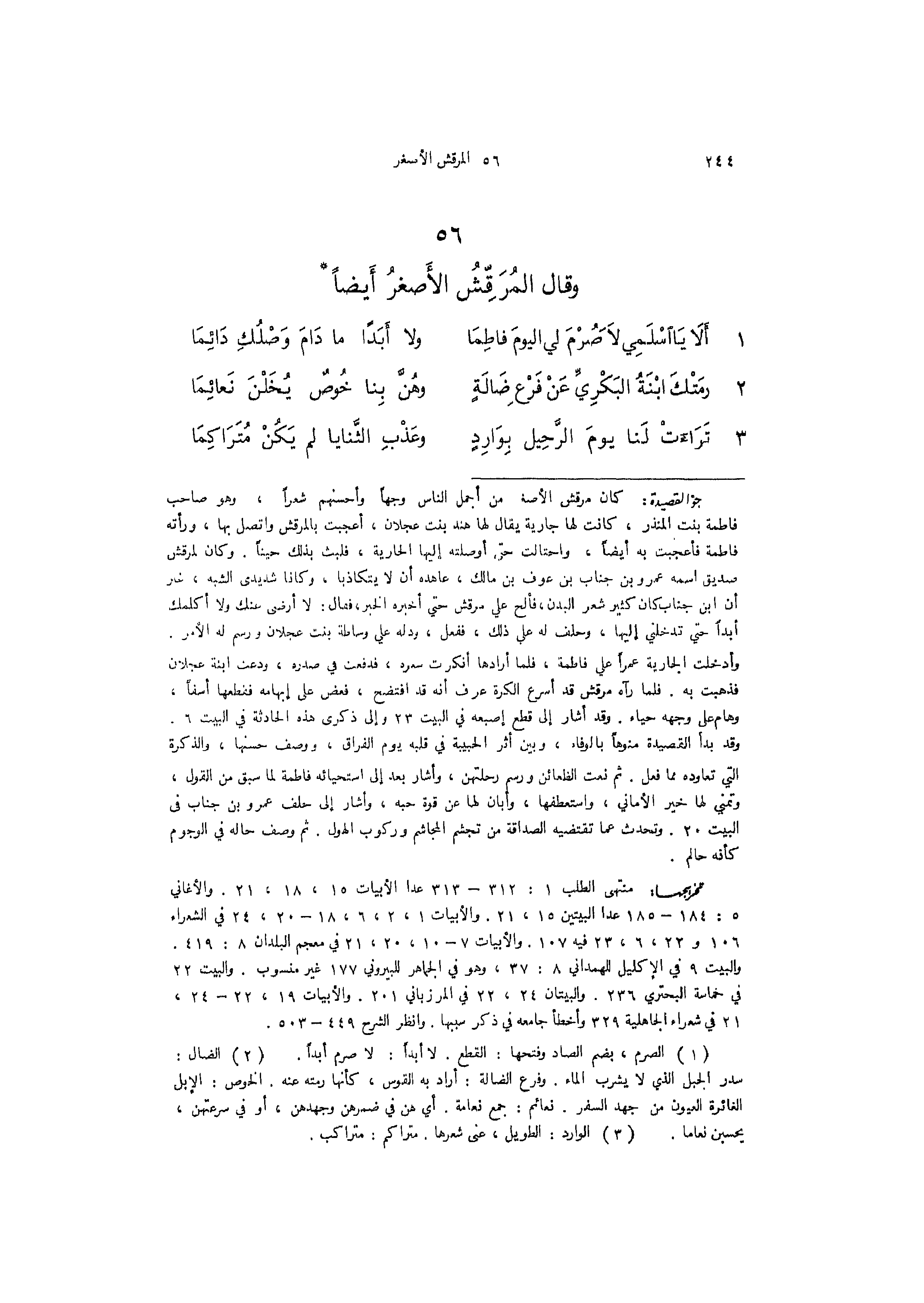 1 - (أَلاَ يَا أسْلَمِي لاَ صُرْمَ لي اليومَ فاطِمَا ... ولا أَبَداً ما دام وَصْلُكِ دَائِمَا)