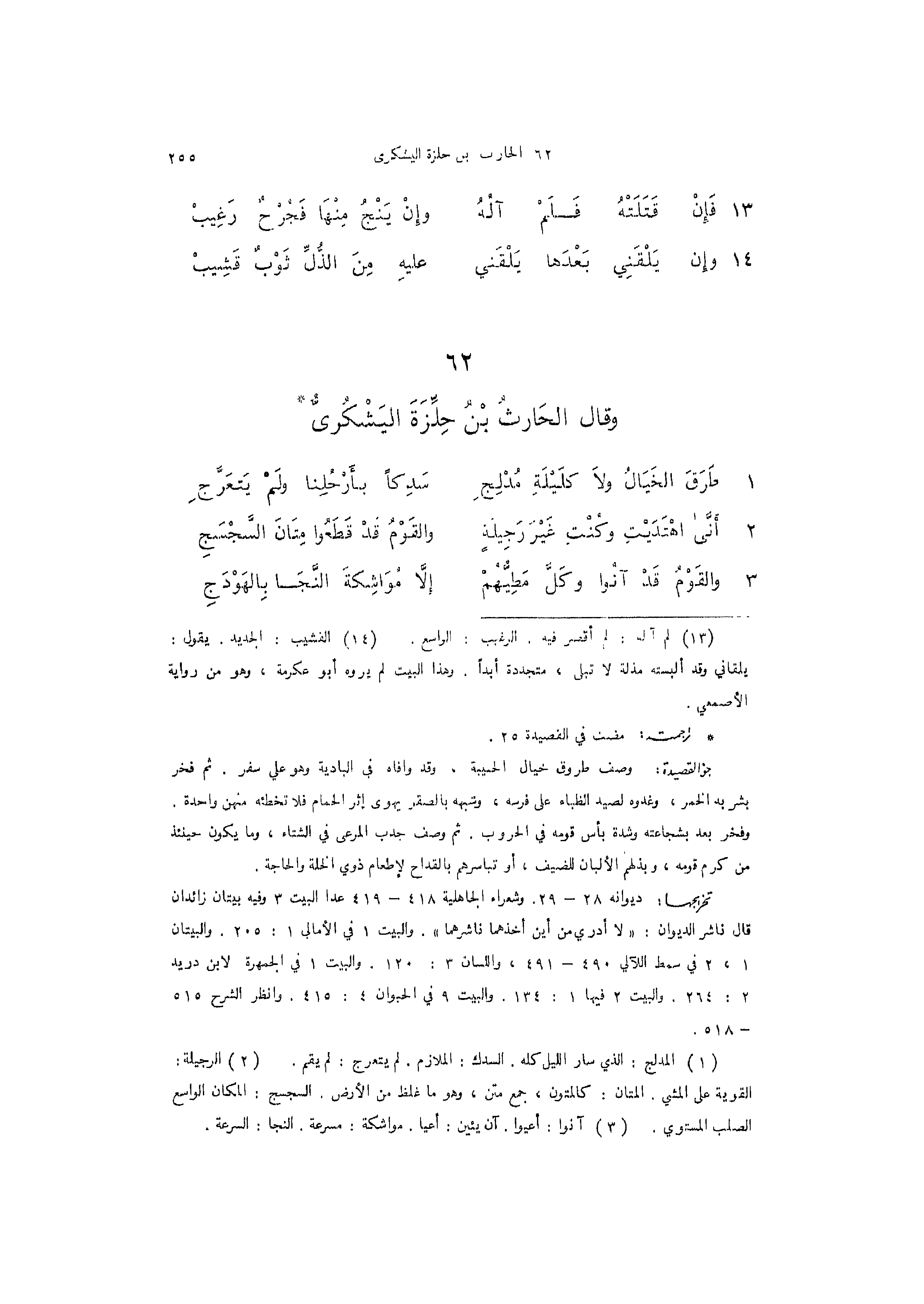 13 - (فَإِنْ قَتَلَتْهُ فَلَمْ آلُهُ ... وإِنْ يَنْجُ مِنْهَا فَجُرْحٌ رَغِيبْ)
