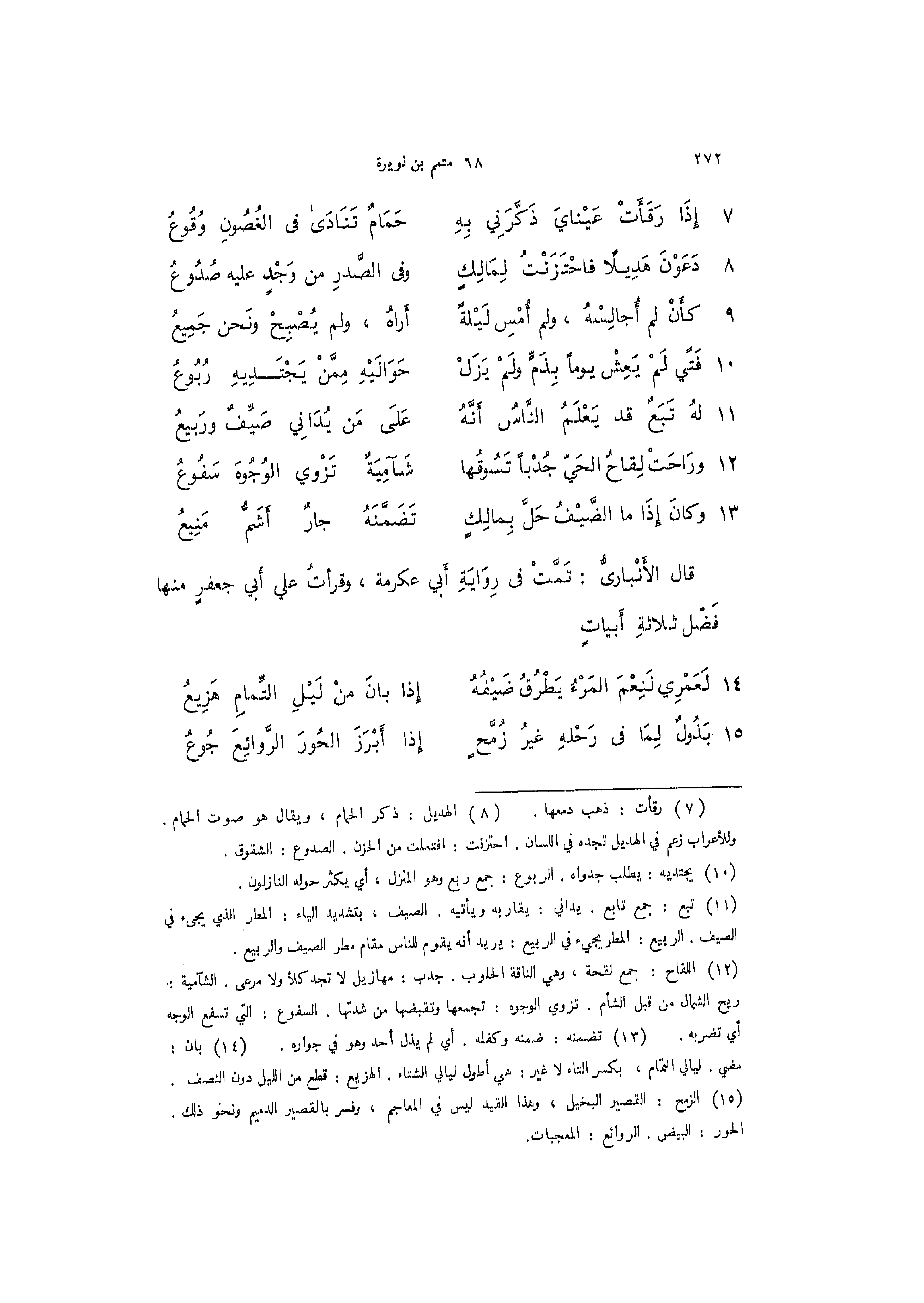 7 - (إِذَا رَقَأَتْ عَيْنايَ ذَكَّرَنِي بِهِ ... حَمَامٌ تَنَادَى في الغُصُونِ وُقُوعُ)