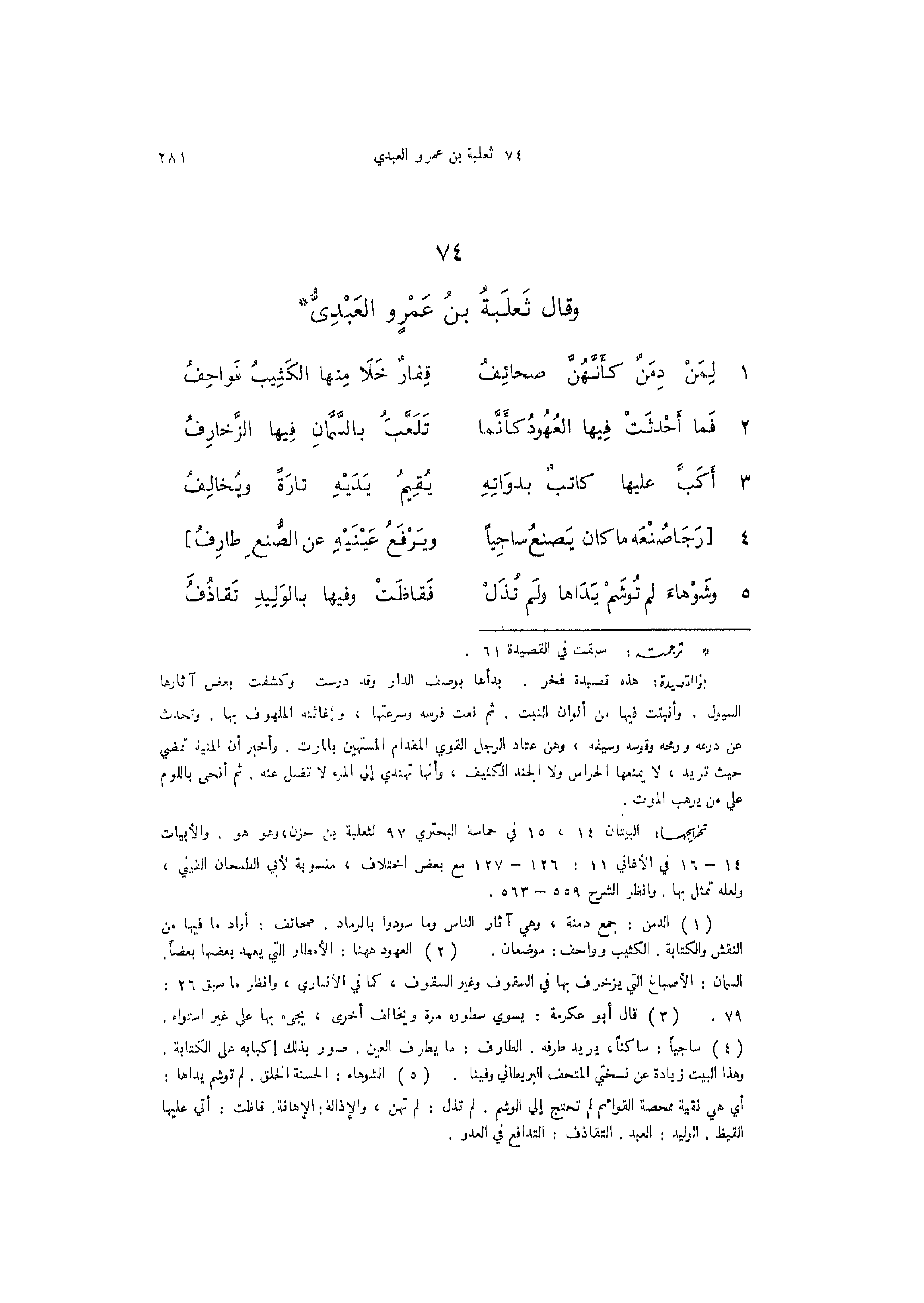 1 - (لِمَنْ دِمَنٌ كأَنَّهُنَّ صحائِفُ ... قِفارٌ خَلاَ مِنها الكثيبف فَواحِفُ)