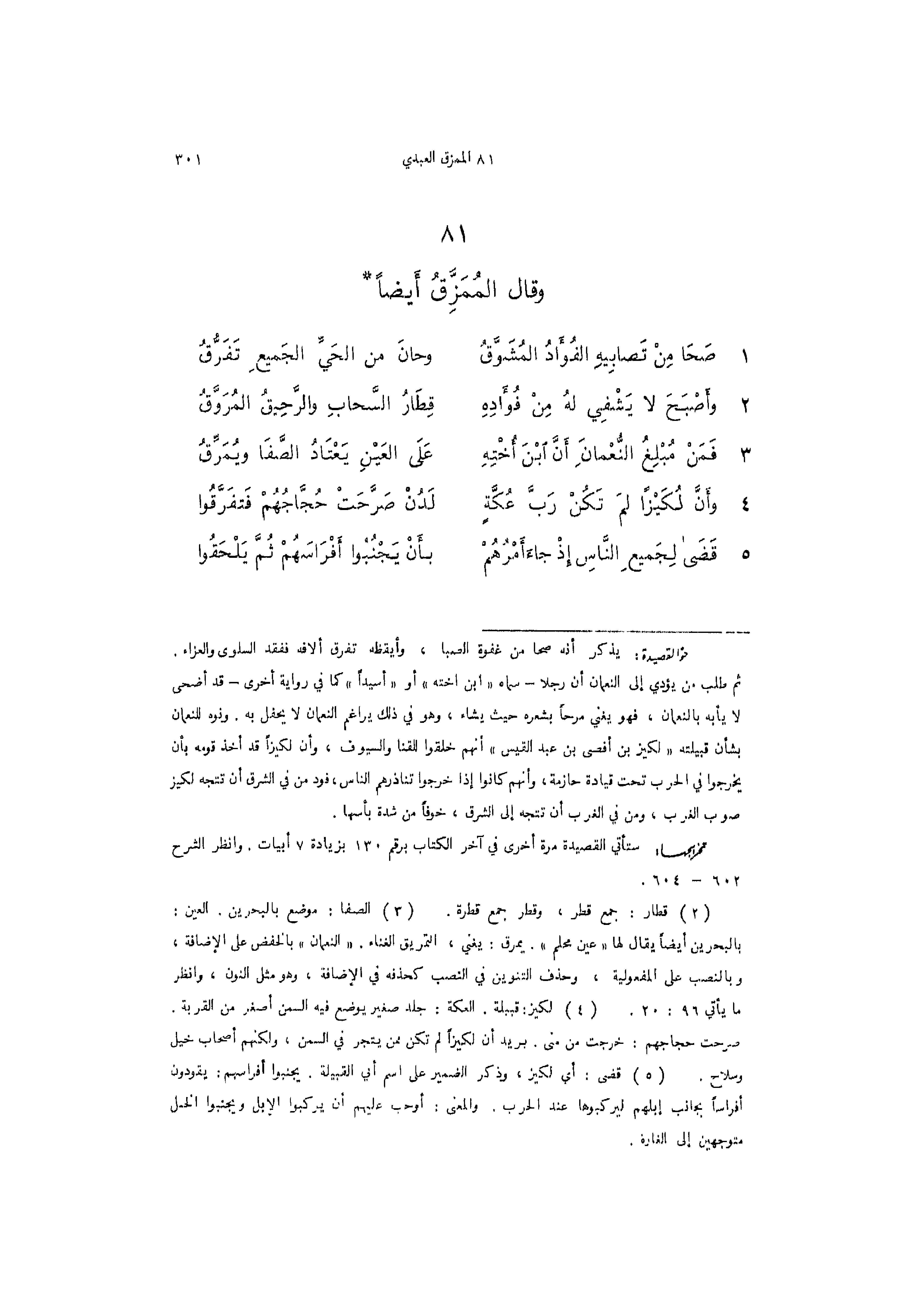 1 - (صَحَا مِنْ تَصابِيهِ الفُؤَادُ المُشَوَّقُ ... وحانَ من الحي الجميع تفرق)