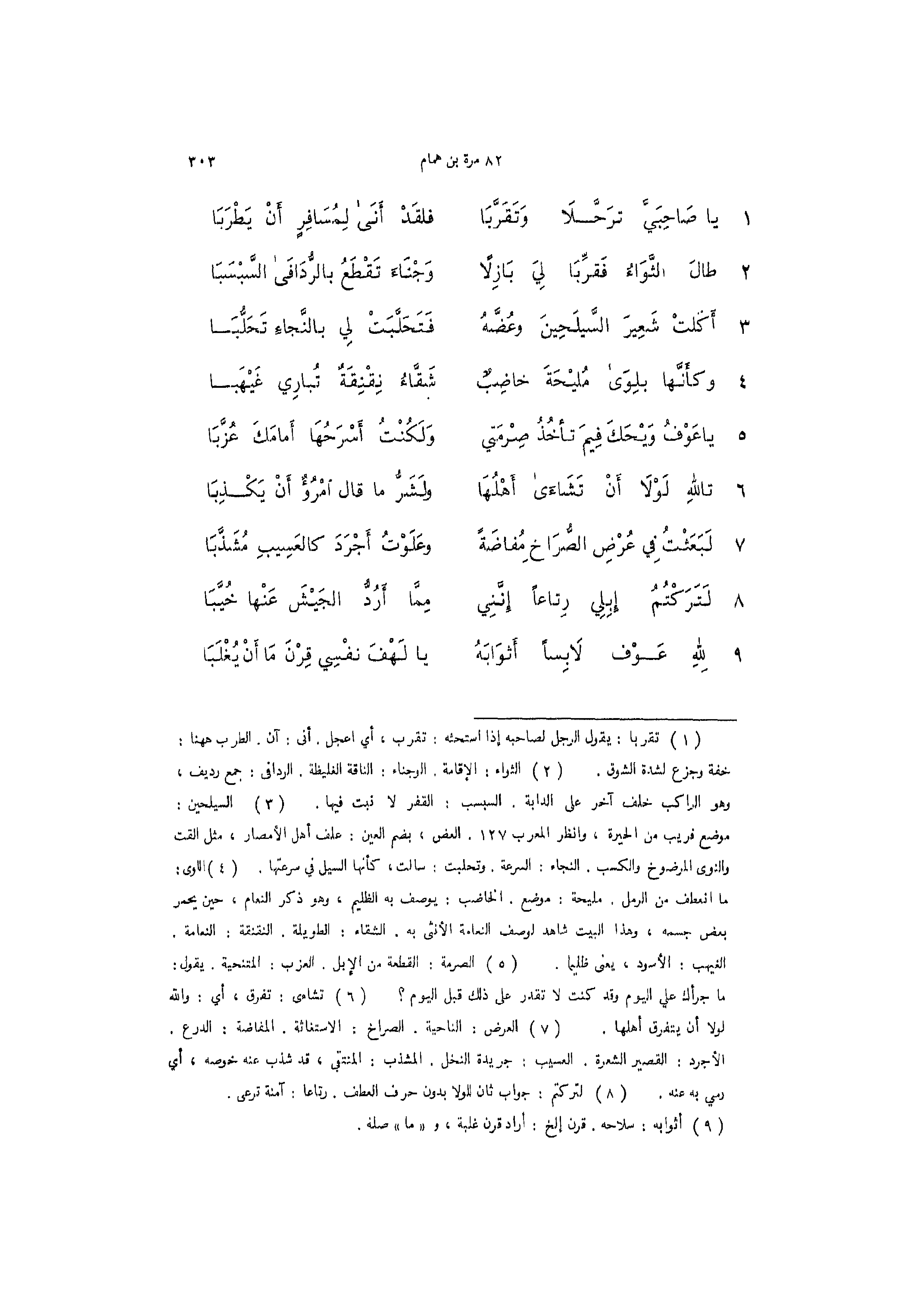 1 - (يا صَاحِبَيَّ ترَحَّلاَ وَتَقَرَّبَا ... فلقَدْ أَنَى لِمُسَافِرٍ أَنْ يَطْرَبَا)