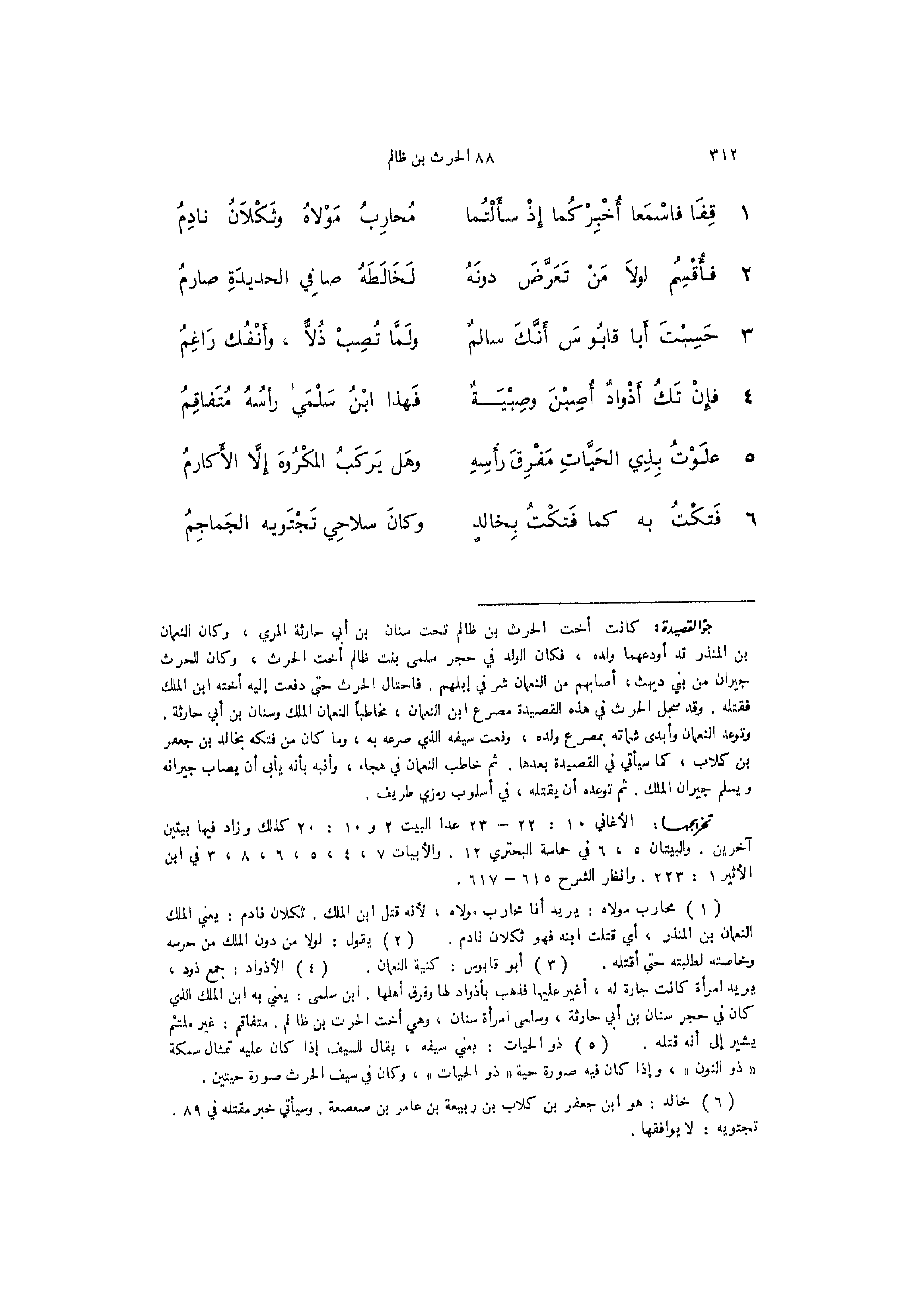 1 - (قِفَا فاسْمَعا أُخْبِرْكُما إِذْ سأَلْتُما ... مُحارِبُ مَوْلاهُ وثَكْلاَنُ نادِمُ)
