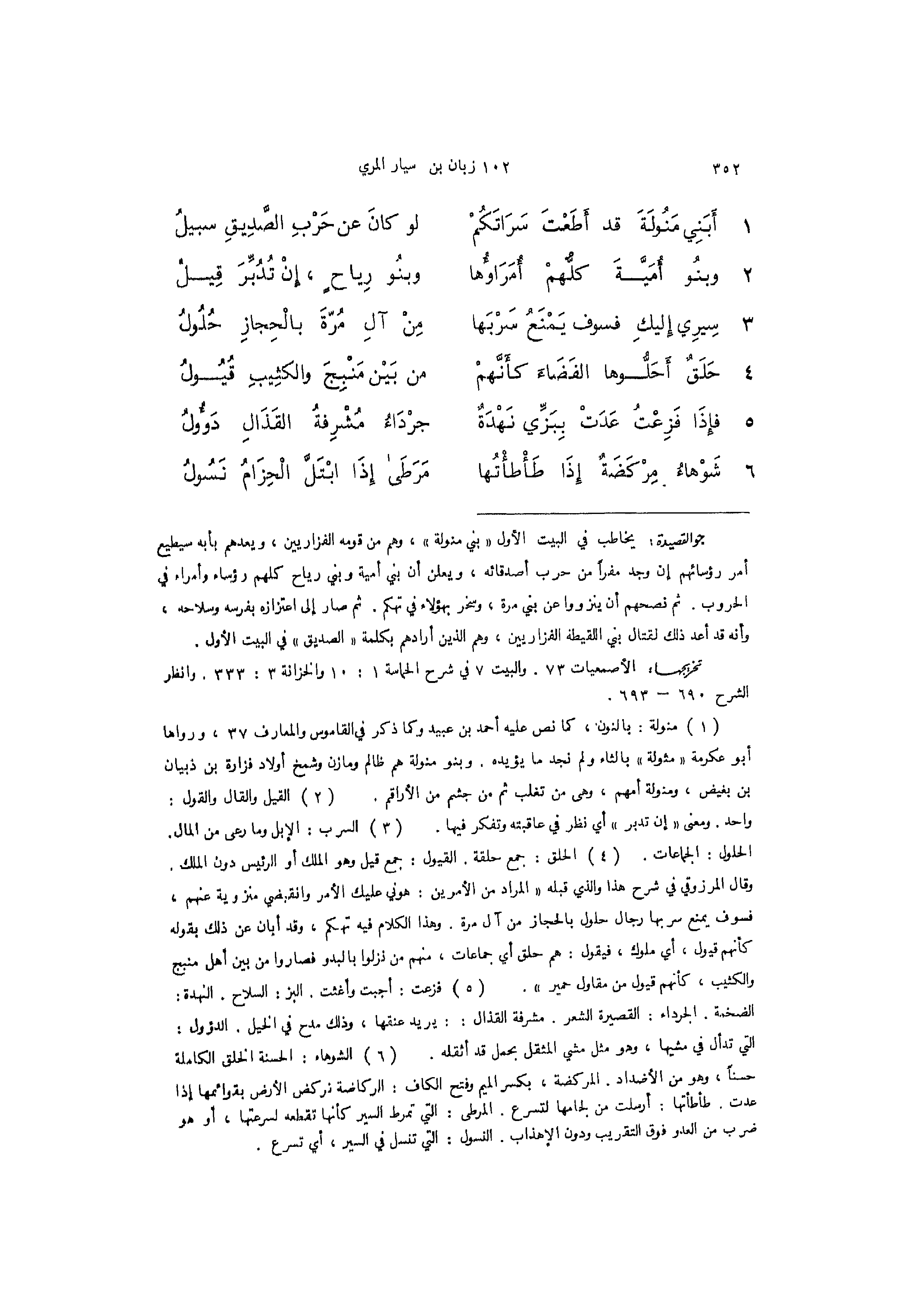 1 - (أَبَنِي مَنُولَةَ قد أَطَعْتَ سَرَاتَكُمْ ... لو كانَ عن حَرْبِ الصَّدِيقِ سبيلُ)