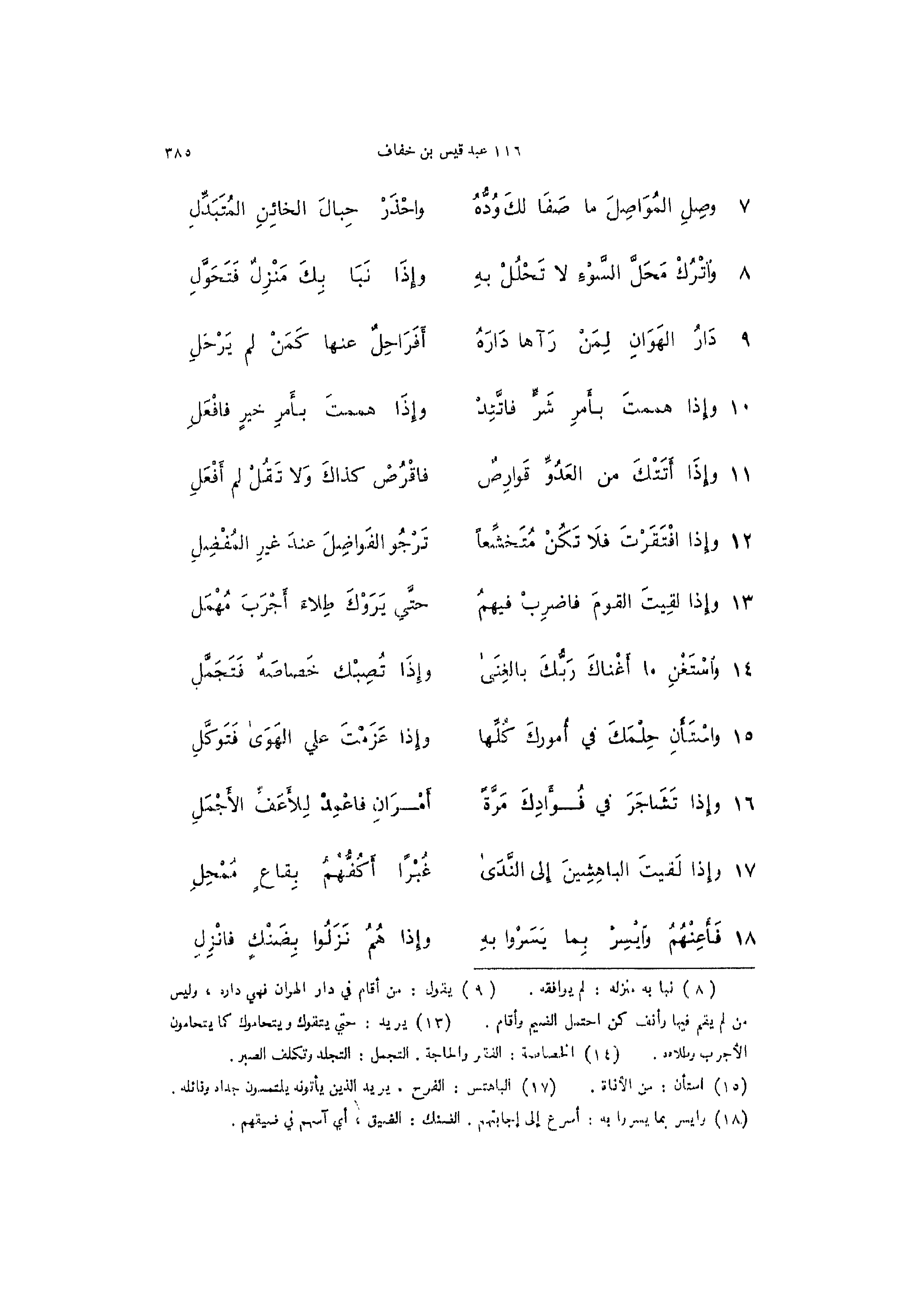 7 - (وصِلِ المُوَاصِلَ ما صَفَا لكَ وُدُّهُ ... واحْذَرْ حِبالَ الخائِنِ المُتَبَدِّلِ)