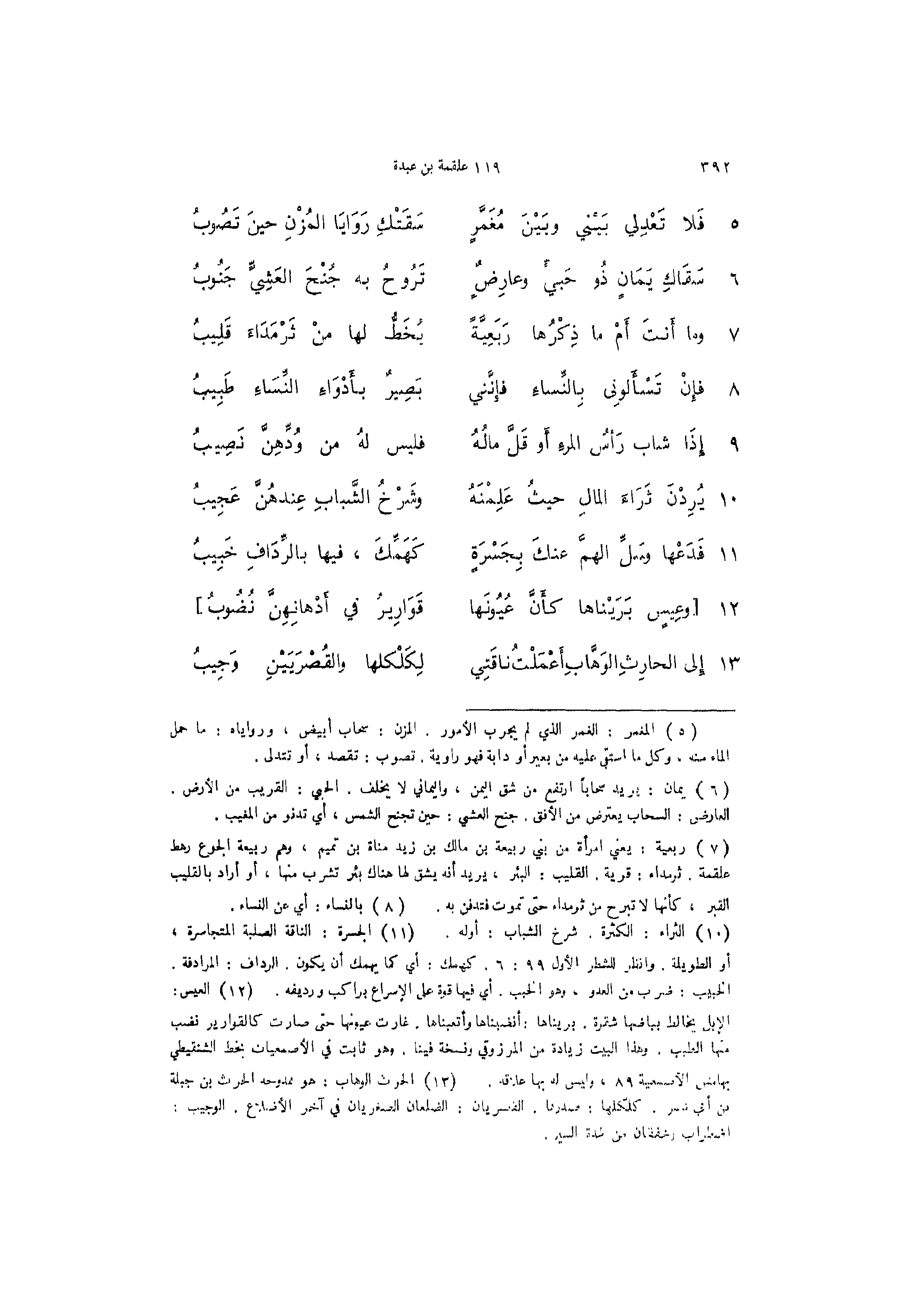 5 - (فَلا تَعْدِلي بَيْني وبَيْنَ مُغَمَّرٍ ... سَقَتْكِ رَوَايَا المُزْنِ حينَ تَصُوبُ)