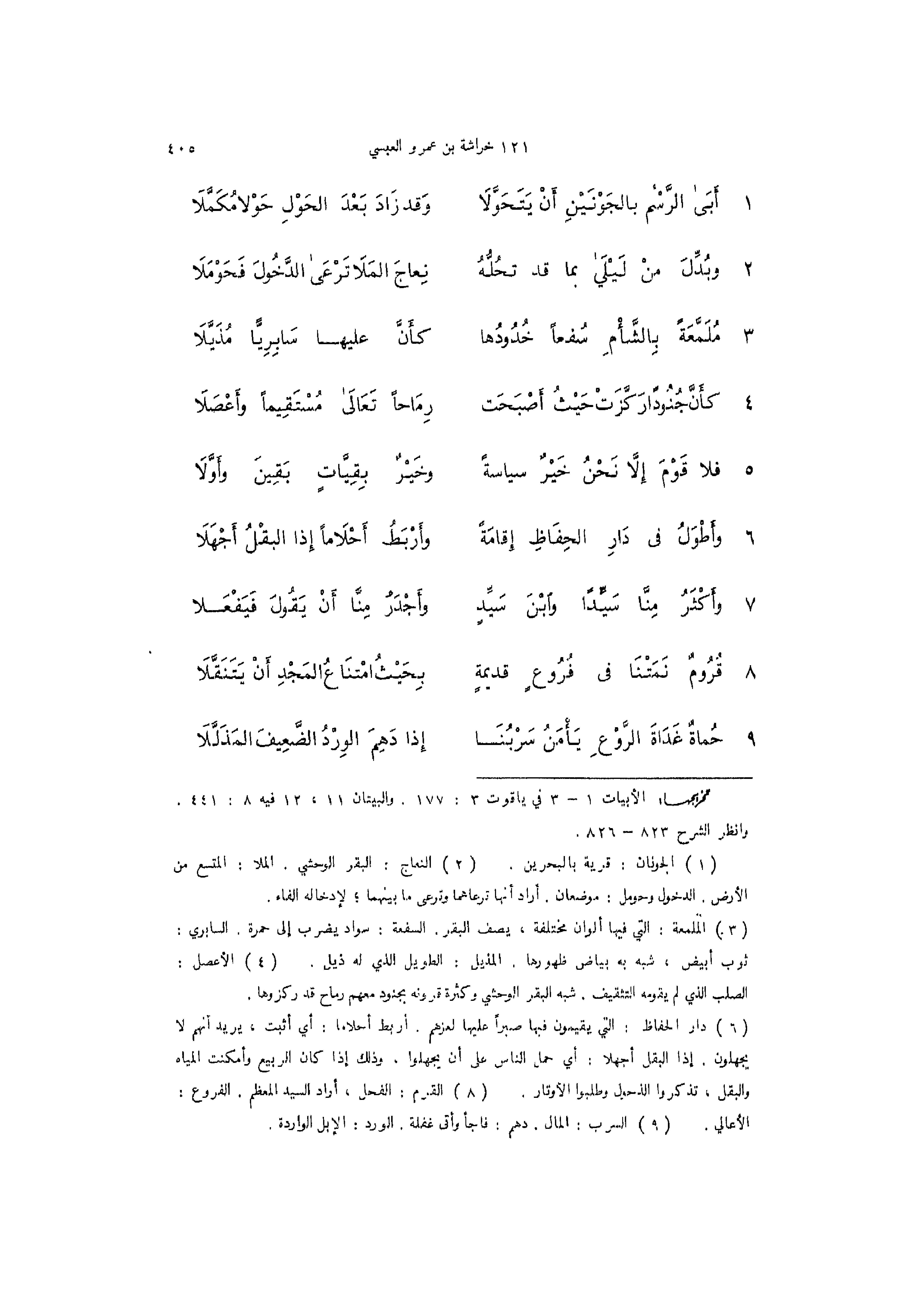 1 - (أَبَى الرَّسْمُ بالجَوْنَيْنِ أن يتحولا ... وقد زَادَ بَعْدَ الحَوْلِ حَوْلا مُكَمَّلاَ)