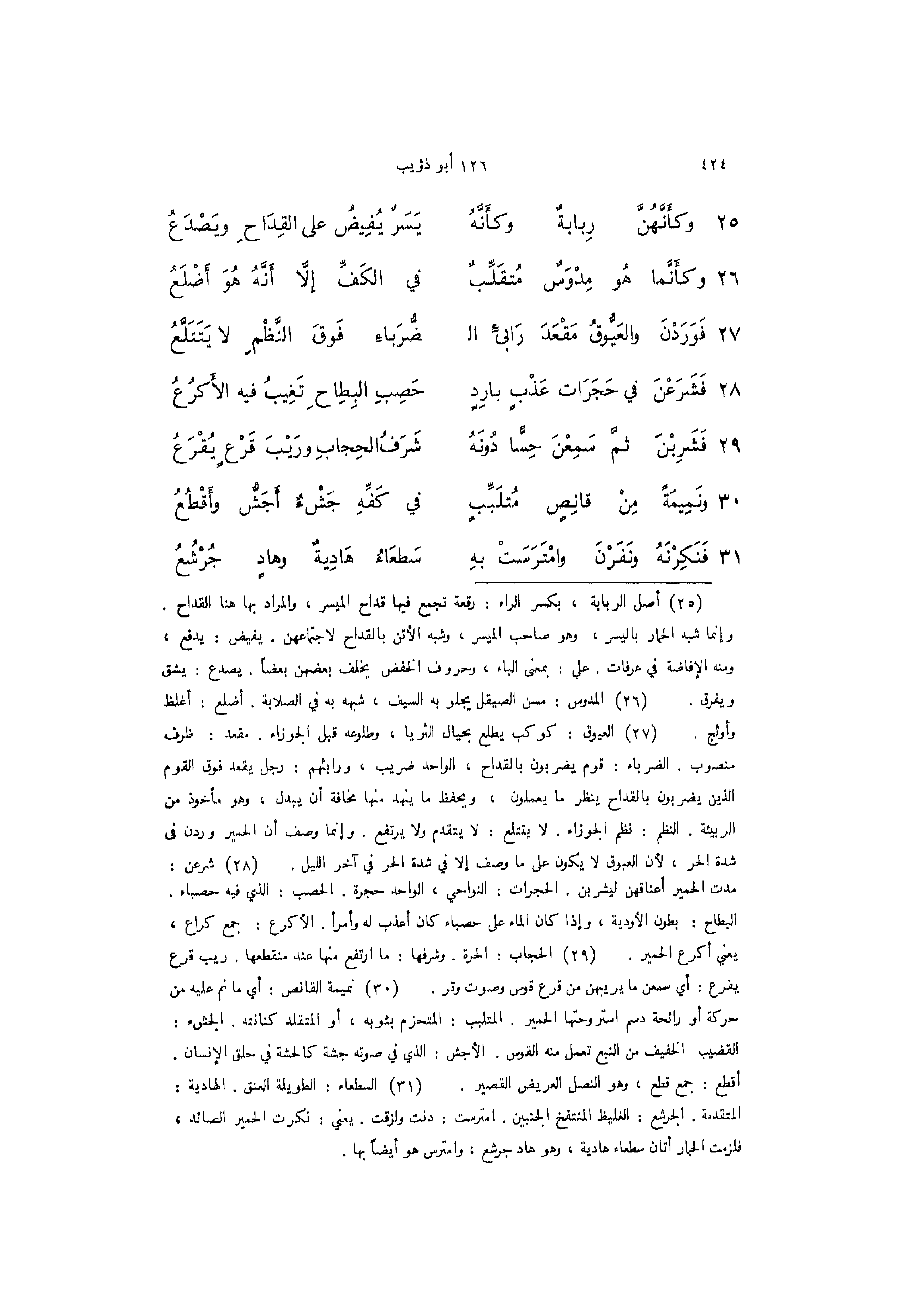 25 - (وكأَنَّهُنَّ رِبابةٌ وكأَنَّهُ ... يَسَرٌ يُفِيضُ على القِدَاحِ ويَصْدَعُ)