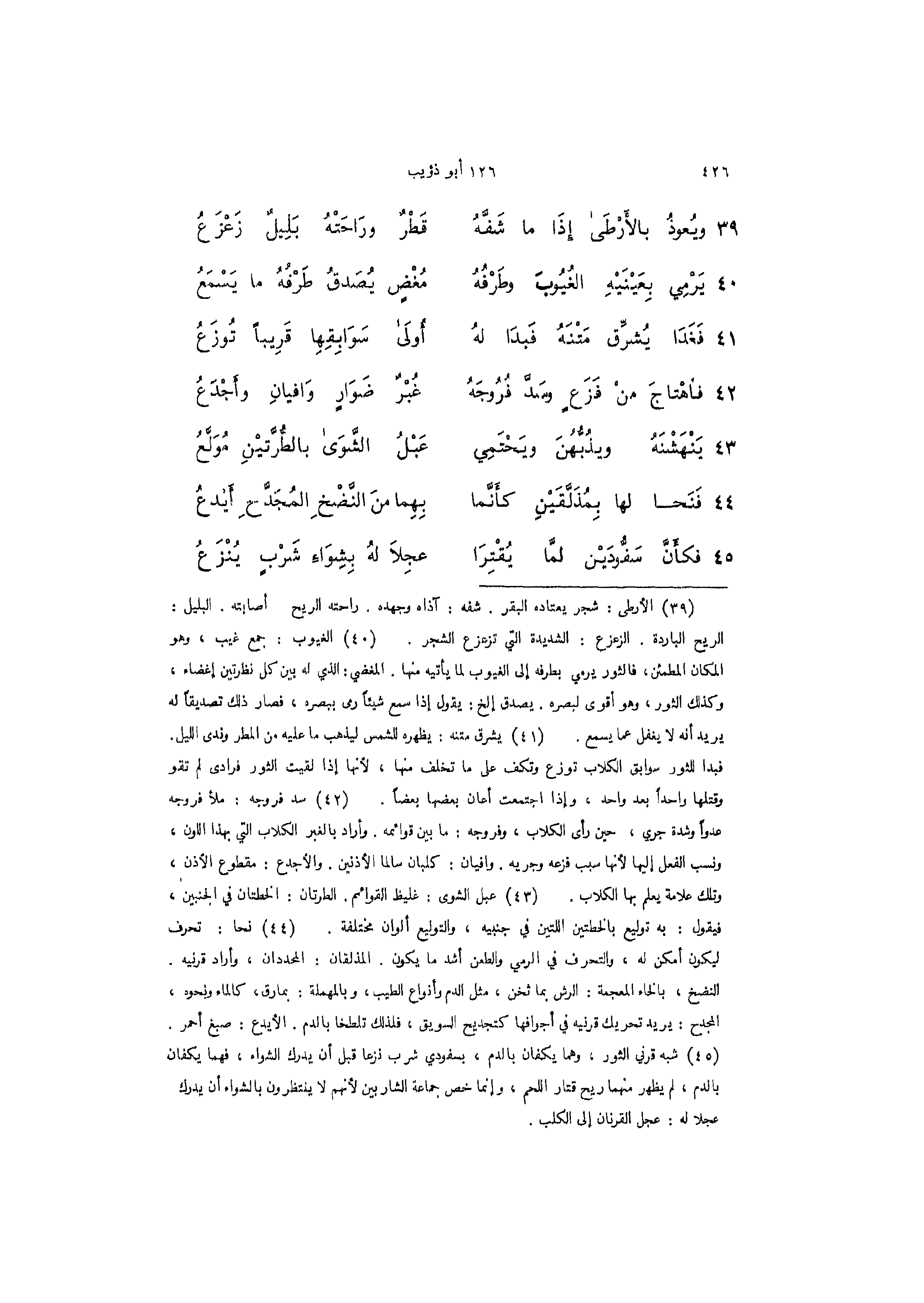 45 - (فكأَنَّ سَفُّودَيْن لمَّا يُقْتِرَا ... عجِلاَ لهُ بِشِوَاءِ شَرْبٍ يُنْزَعُ)