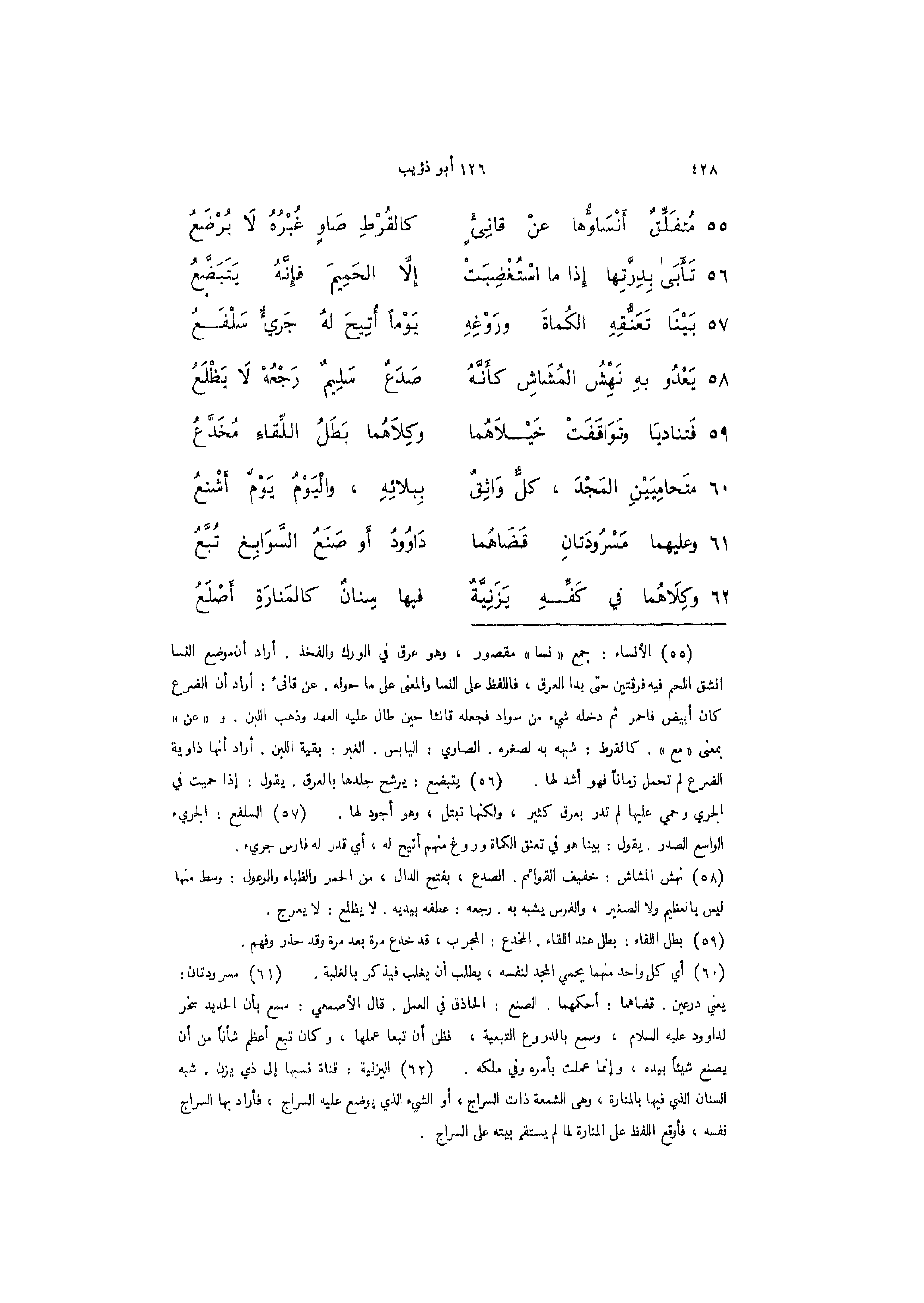 55 - (مُتفَلِّقٌ أَنْسَاؤُها عنْ قانئ ... كالقُرْطِ صَاوٍ غُبْرُهُ لا يرضع)