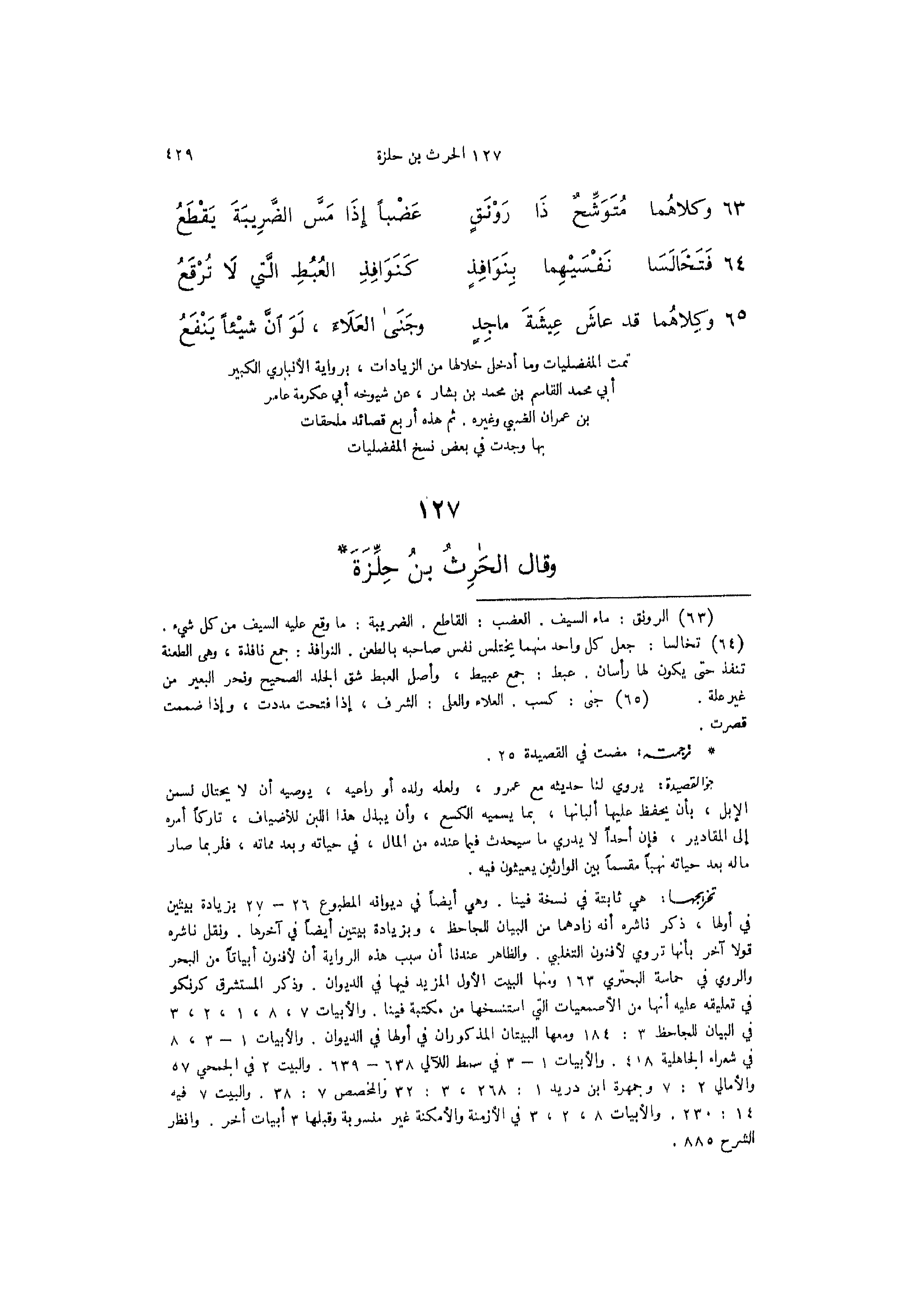تمت المفضليات وما أدخل خلالها من الزيادات برواية الأنبار الكبير أبي محمد القاسم بن محمد بن بشار عن شيوخه أبي عكرمة عامر بن عمران الضبي وغيره ثم هذه أربع قصائد ملحقات بها وجدت في بعض نسخ المفضليات (127) وقال الحرث بن حلزة