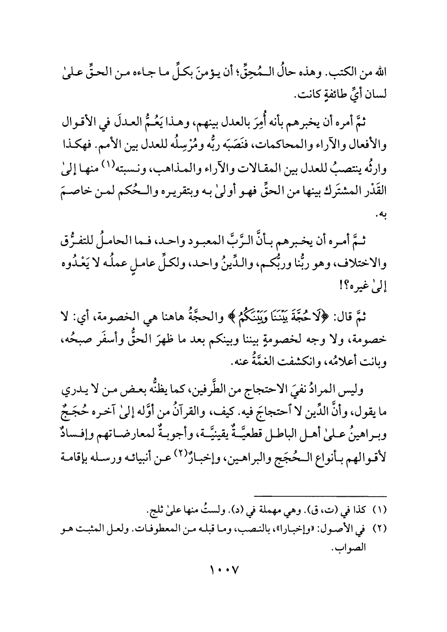 وليس المرادُ نفيَ الاحتجاج من الطَّرفين، كما يظنُّه بعض من لا يدري ما يقول، وأنَّ الدِّين لا احتجاجَ فيه. كيف، والقرآنُ من أوَّله إلى آخره حُجَجٌ وبراهينُ على أهل الباطل قطعيَّةٌ يقينيَّة، وأجوبةٌ لمعارضاتهم وإفسادٌ لأقوالهم بأنواع الحُجَج والبراهين، وإخبارٌ (¬٢) عن أنبيائه ورسله بإقامة