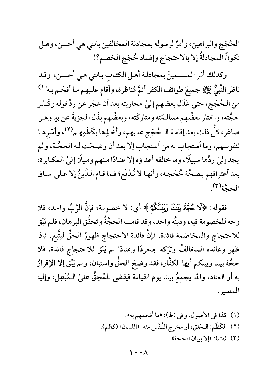 وكذلك أمَر المسلمينَ بمجادلة أهل الكتابِ بالتي هي أحسن، وقد ناظر النَّبيُّ - صلى الله عليه وسلم - جميعَ طوائف الكفر أتمَّ مُناظرة، وأقام عليهم ما أفحَم به (¬١) من الحُجَج، حتى عَدَل بعضهم إلى محاربته بعد أن عجَز عن ردِّ قوله وكَسْر حجَّته، واختار بعضُهم مسالمَته ومتاركَته، وبعضُهم بذَل الجزيةَ عن يدٍ وهو صاغر، كلُّ ذلك بعد إقامة الحُجَج عليهم، وأخْذِها بكَظَمِهم (¬٢)، وأسْرِها لنفوسهم، وما استجاب له من استجاب إلا بعد أن وضحَت له الحجَّة، ولم يجد إلى ردِّها سبيلًا، وما خالفه أعداؤه إلا عنادًا منهم وميلًا إلى المكابرة، بعد اعترافهم بصحَّة حُجَجه، وأنها لا تُدْفَع؛ فما قام الدِّينُ إلا على ساق الحجَّة (¬٣).