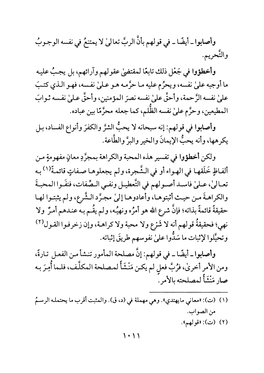 وأصابوا ــ أيضًا ــ في قولهم بأنَّ الربَّ تعالى لا يمتنعُ في نفسه الوجوبُ والتَّحريم.