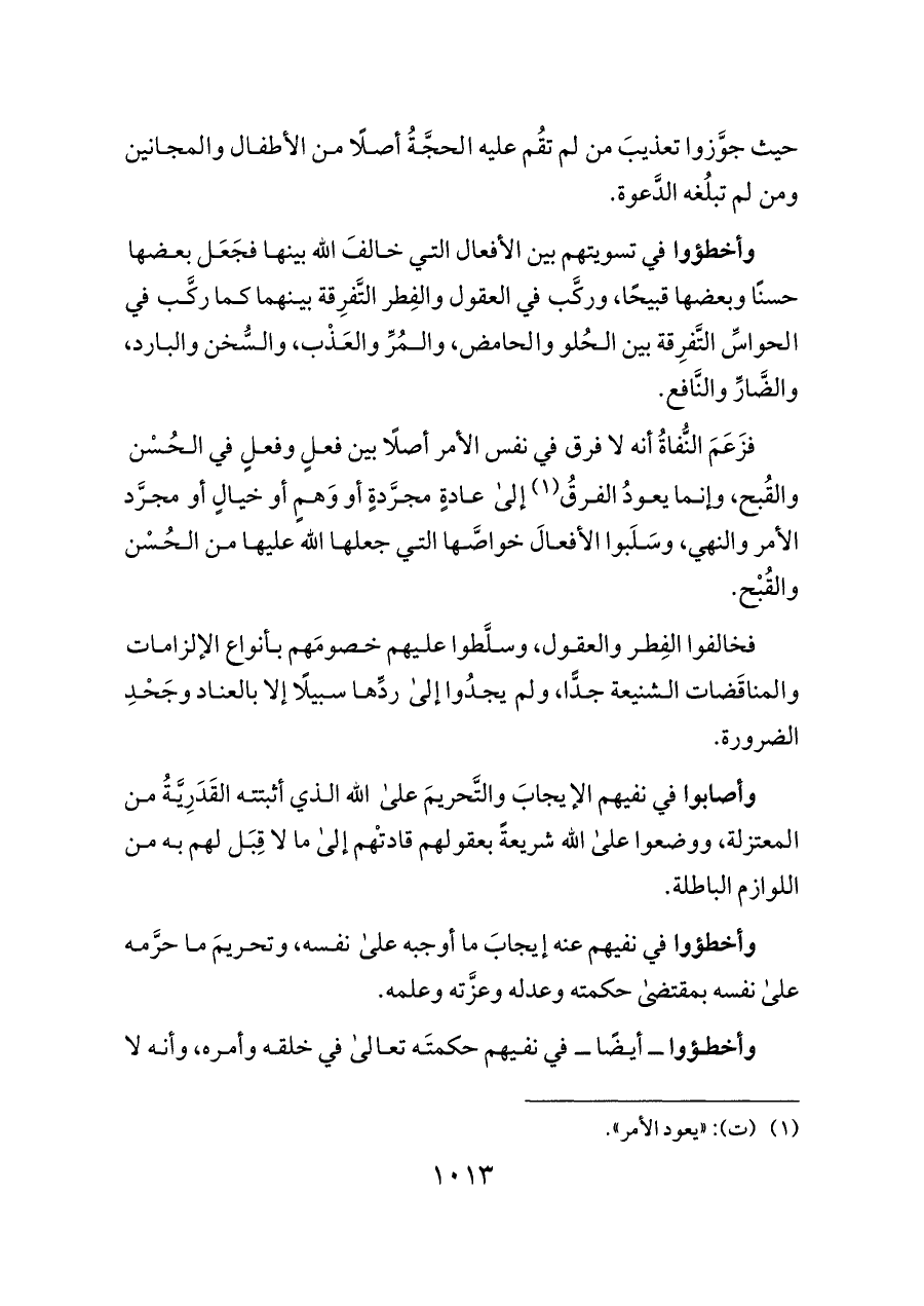 وأخطؤوا في نفيهم عنه إيجابَ ما أوجبه على نفسه، وتحريمَ ما حرَّمه على نفسه بمقتضى حكمته وعدله وعزَّته وعلمه.