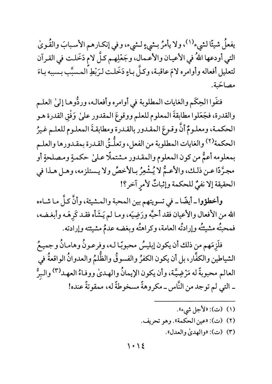 فنفَوا الحِكَم والغايات المطلوبة في أوامره وأفعاله، وردُّوها إلى العلم والقدرة، فجَعَلوا مطابقةَ المعلوم للعلم ووقوعَ المقدور على وَفْقِ القدرة هو الحكمة، ومعلومٌ أنَّ وقوعَ المقدور بالقدرة ومطابقةَ المعلوم للعلم غيرُ الحكمة (¬٢) والغايات المطلوبة من الفعل، وتعلُّقُ القدرة بمقدورها والعلم بمعلومه أعمُّ من كون المعلوم والمقدور مشتملًا على حكمةٍ ومصلحةٍ أو مجرَّدًا عن ذلك، والأعمُّ لا يُشْعِرُ بالأخصِّ ولا يستلزمه، وهل هذا في الحقيقة إلا نفيٌ للحكمة وإثباتٌ لأمرٍ آخر؟!