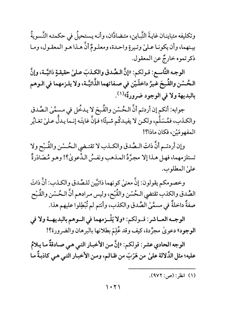الوجه التَّاسع: قولكم: «إنَّ الصِّدق والكذبَ على حقيقةٍ ذاتيَّة، وإنَّ الحُسْن والقُبحَ غيرُ داخلَيْن في صفاتهما الذَّاتيَّة، ولا يلزمهما في الوهم بالبديهة ولا في الوجود ضرورةً» (¬١).
