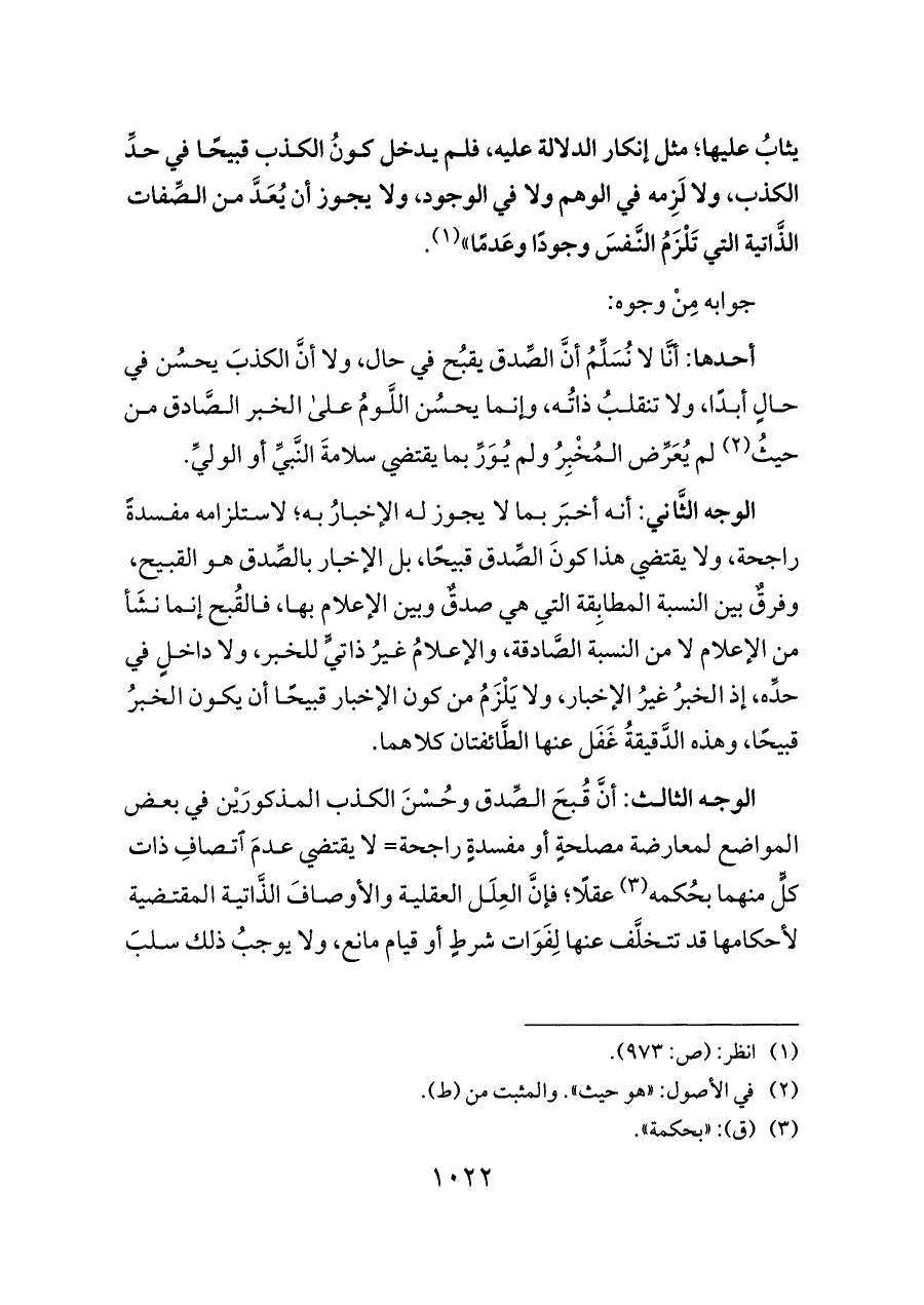 الوجه الثالث: أنَّ قُبحَ الصِّدق وحُسْنَ الكذب المذكورَيْن في بعض المواضع لمعارضة مصلحةٍ أو مفسدةٍ راجحة= لا يقتضي عدمَ اتصافِ ذات كلٍّ منهما بحُكمه (¬٣) عقلًا؛ فإنَّ العِلَل العقلية والأوصافَ الذَّاتية المقتضية لأحكامها قد تتخلَّف عنها لِفَوَات شرطٍ أو قيام مانع، ولا يوجبُ ذلك سلبَ