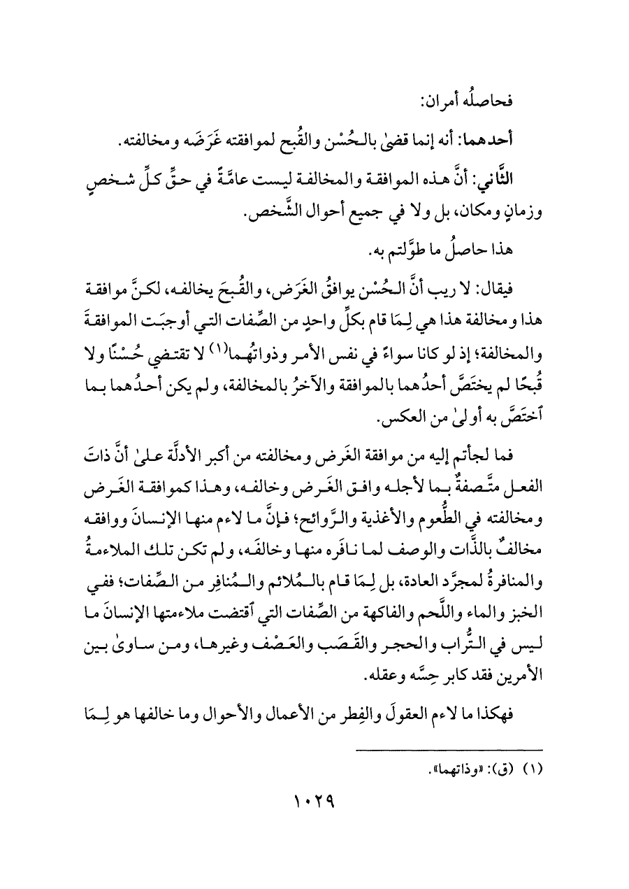 فيقال: لا ريب أنَّ الحُسْن يوافقُ الغَرَض، والقُبحَ يخالفه، لكنَّ موافقة هذا ومخالفة هذا هي لِمَا قام بكلِّ واحدٍ من الصِّفات التي أوجبَت الموافقةَ والمخالفة؛ إذ لو كانا سواءً في نفس الأمر وذواتُهما (¬١) لا تقتضي حُسْنًا ولا قُبحًا لم يختَصَّ أحدُهما بالموافقة والآخرُ بالمخالفة، ولم يكن أحدُهما بما اختَصَّ به أولى من العكس.