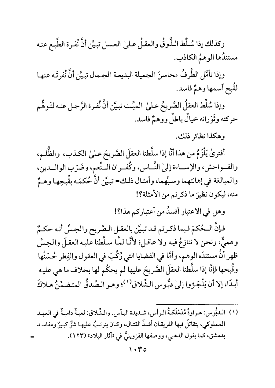 وكذلك إذا سُلِّط الذَّوقُ والعقلُ على العسل تبيَّن أنَّ نُفرة الطَّبع عنه مستندُها الوهمُ الكاذب.
