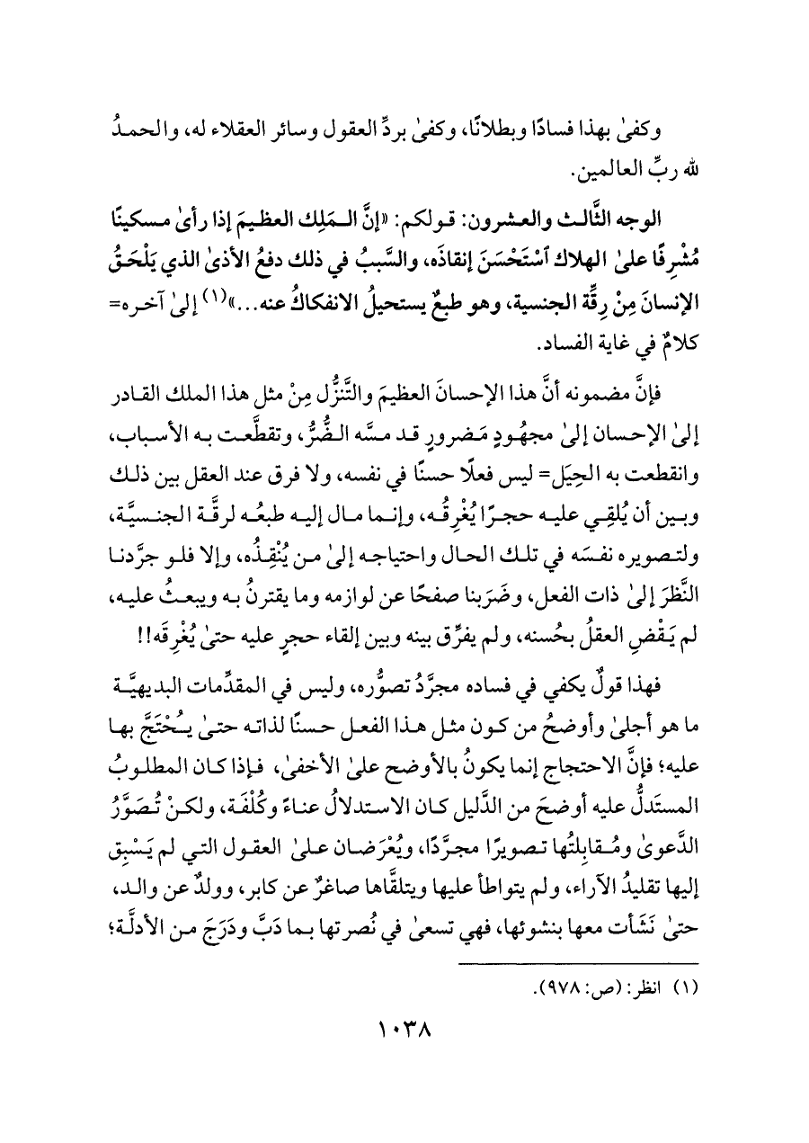 الوجه الثَّالث والعشرون: قولكم: «إنَّ المَلِك العظيمَ إذا رأى مسكينًا مُشْرِفًا على الهلاك اسْتَحْسَنَ إنقاذَه، والسَّببُ في ذلك دفعُ الأذى الذي يَلْحَقُ الإنسانَ مِنْ رِقِّة الجنسية، وهو طبعٌ يستحيلُ الانفكاكُ عنه ... » (¬١) إلى آخره= كلامٌ في غاية الفساد.