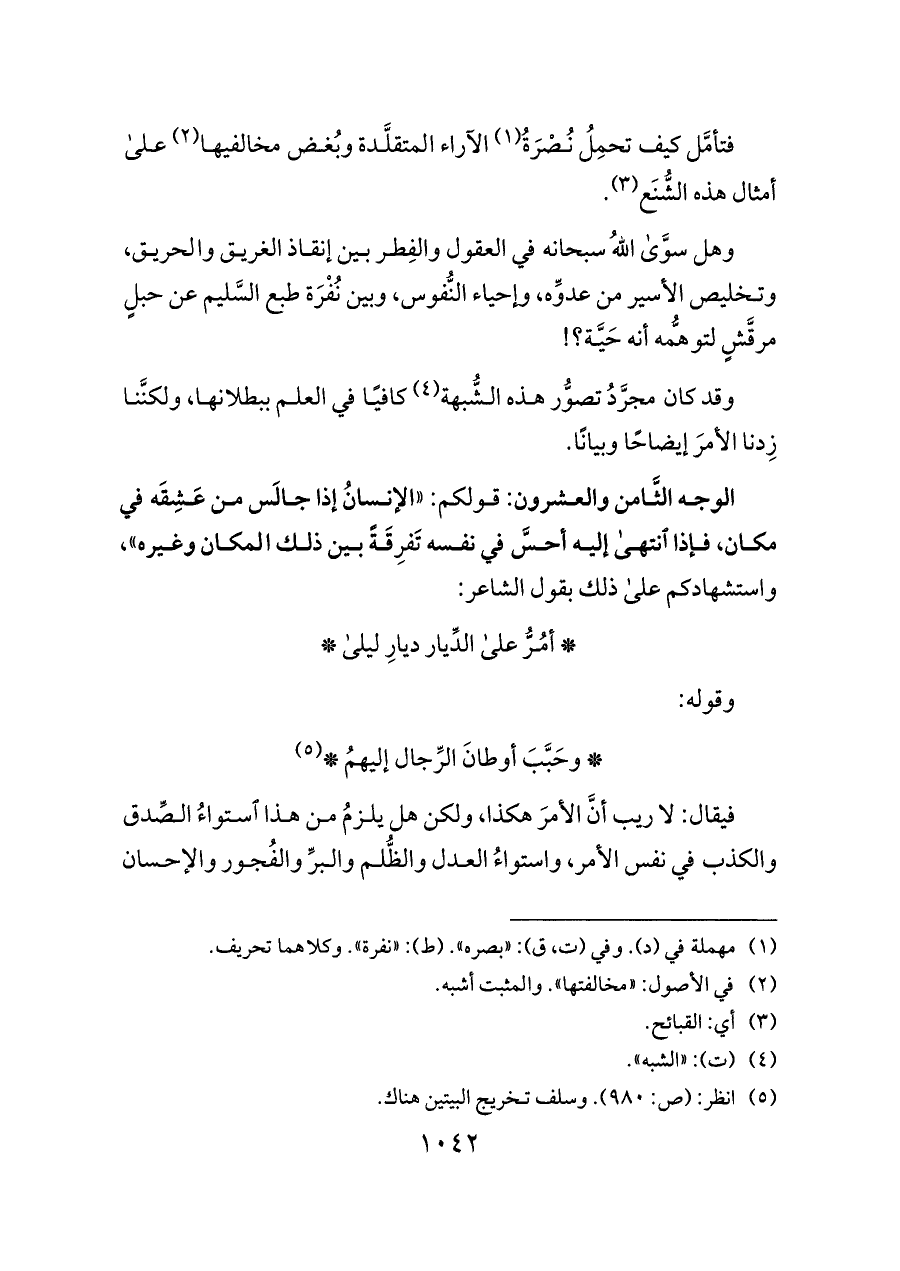 الوجه الثَّامن والعشرون: قولكم: «الإنسانُ إذا جالَس من عَشِقَه في مكان، فإذا انتهى إليه أحسَّ في نفسه تَفرِقَةً بين ذلك المكان وغيره»، واستشهادكم على ذلك بقول الشاعر: