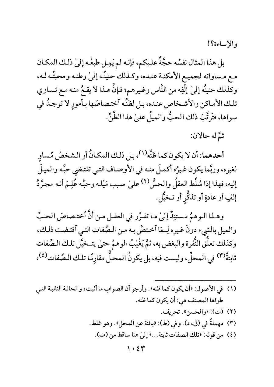 بل هذا المثال نفسُه حجَّةٌ عليكم، فإنه لم يَمِل طبعُه إلى ذلك المكان مع مساواته لجميع الأمكنة عنده، وكذلك حنينُه إلى وطنه ومحبتُه له، وكذلك حنينُه إلى إلْفِه من النَّاس وغيرهم؛ فإنَّ هذا لا يقعُ منه مع تساوي تلك الأماكن والأشخاص عنده، بل لظنِّه اختصاصَها بأمورٍ لا توجدُ في سواها، فتَرتَّبَ ذلك الحبُّ والميلُ على هذا الظَّنِّ.