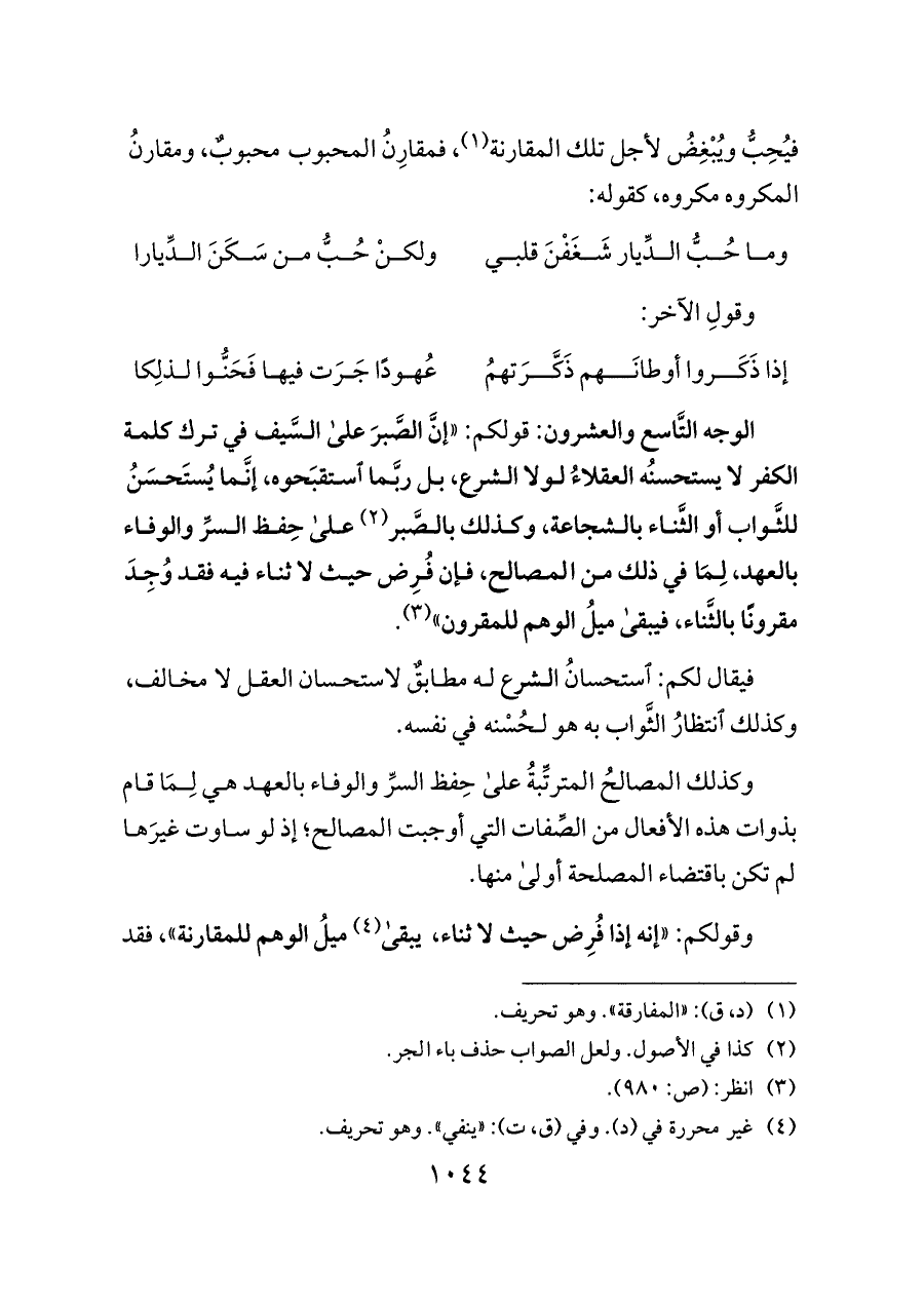 الوجه التَّاسع والعشرون: قولكم: «إنَّ الصَّبرَ على السَّيف في ترك كلمة الكفر لا يستحسنُه العقلاءُ لولا الشرع، بل ربَّما استقبَحوه، إنَّما يُستَحسَنُ للثَّواب أو الثَّناء بالشجاعة، وكذلك بالصَّبر (¬٢) على حِفظ السرِّ والوفاء بالعهد، لِمَا في ذلك من المصالح، فإن فُرِض حيث لا ثناء فيه فقد وُجِدَ مقرونًا بالثَّناء، فيبقى ميلُ الوهم للمقرون» (¬٣).