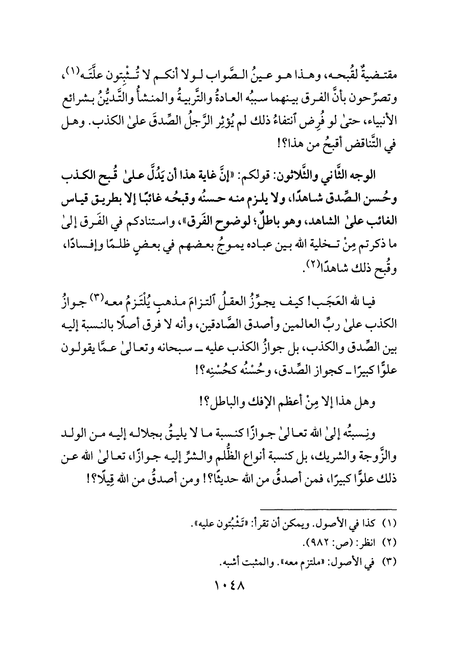 فيا لله العَجَب! كيف يجوِّزُ العقلُ التزامَ مذهبٍ يُلْتَزمُ معه (¬٤) جوازُ الكذب على ربِّ العالمين وأصدق الصَّادقين، وأنه لا فرق أصلًا بالنسبة إليه بين الصِّدق والكذب، بل جوازُ الكذب عليه ــ سبحانه وتعالى عمَّا يقولون علوًّا كبيرًا ــ كجواز الصِّدق، وحُسْنُه كحُسْنِه؟!