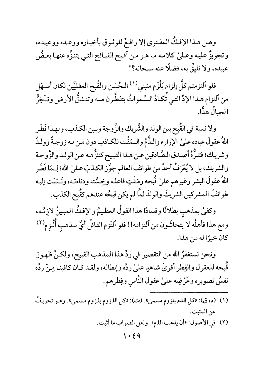 وكفى بمذهبٍ بطلانًا وفسادًا هذا القولُ العظيمُ والإفكُ المبينُ لازِمُه، ومع هذا فأهلُه لا يتحاشَون من التزامه!! فلو التَزم القائلُ أيَّ مذهبٍ أُلْزِم (¬٢) كان خيرًا له من هذا.