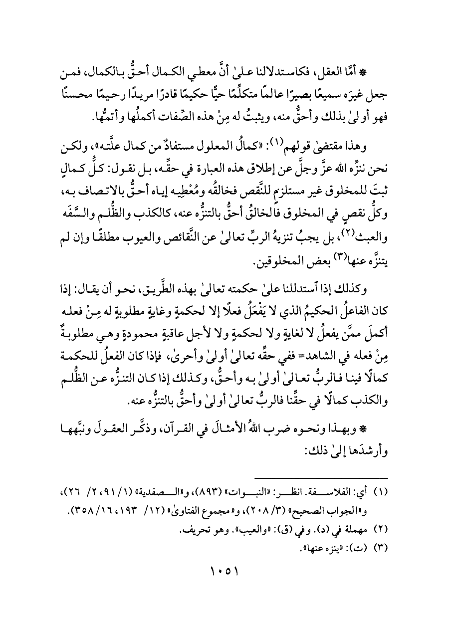 وكذلك إذا استدللنا على حكمته تعالى بهذه الطَّريق، نحو أن يقال: إذا كان الفاعلُ الحكيمُ الذي لا يَفْعَلُ فعلًا إلا لحكمةٍ وغايةٍ مطلوبةٍ له مِنْ فعله أكملَ ممَّن يفعلُ لا لغايةٍ ولا لحكمةٍ ولا لأجل عاقبةٍ محمودةٍ وهي مطلوبةٌ مِنْ فعله في الشاهد= ففي حقِّه تعالى أولى وأحرى، فإذا كان الفعلُ للحكمة كمالًا فينا فالربُّ تعالى أولى به وأحقُّ، وكذلك إذا كان التنزُّه عن الظُّلم والكذب كمالًا في حقِّنا فالربُّ تعالى أولى وأحقُّ بالتنزُّه عنه.