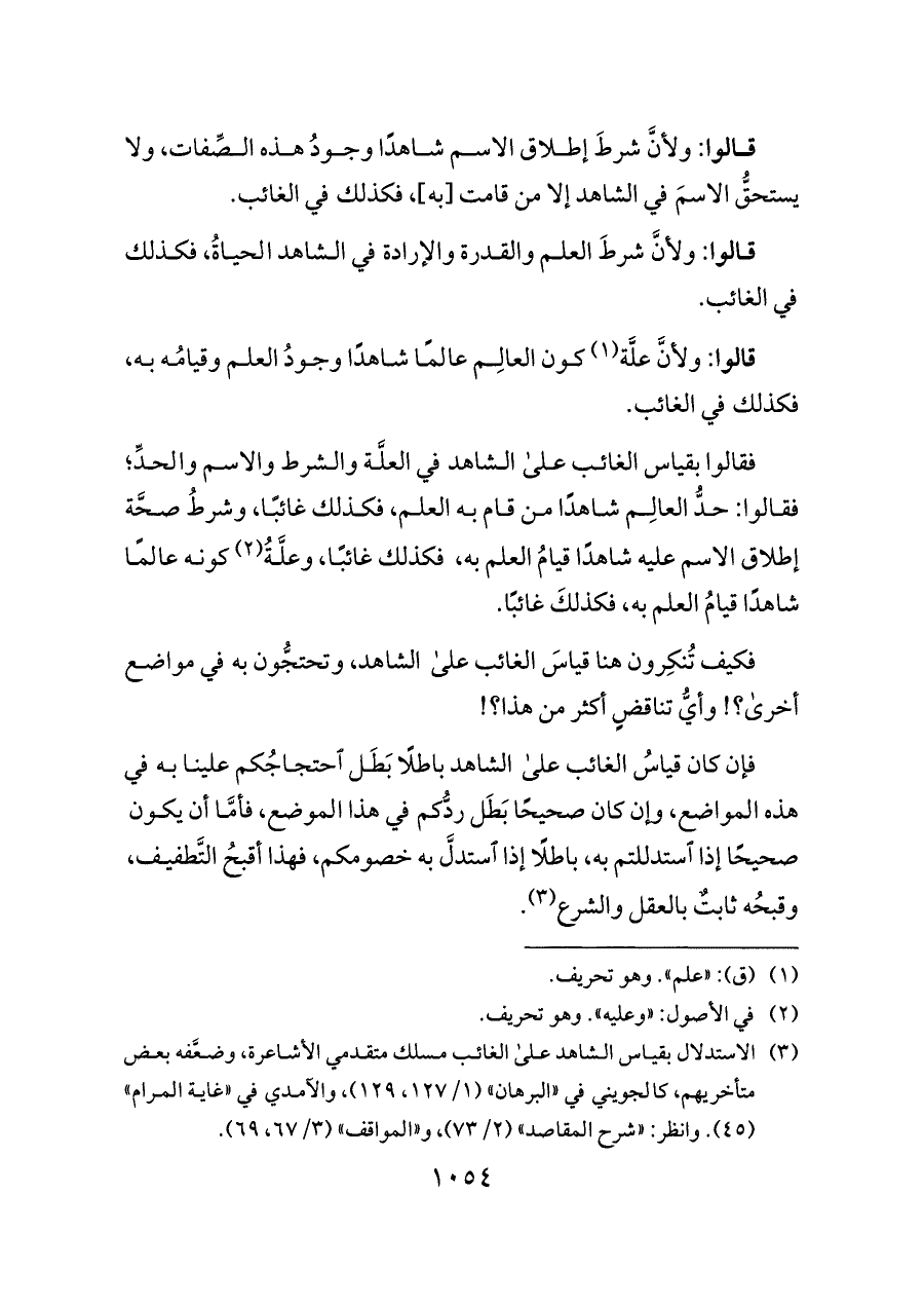 (¬٣) الاستدلال بقياس الشاهد على الغائب مسلك متقدمي الأشاعرة، وضعَّفه بعض متأخريهم، كالجويني في «البرهان» (١/ ١٢٧، ١٢٩)، والآمدي في «غاية المرام» (٤٥). وانظر: «شرح المقاصد» (٢/ ٧٣)، و «المواقف» (٣/ ٦٧، ٦٩).