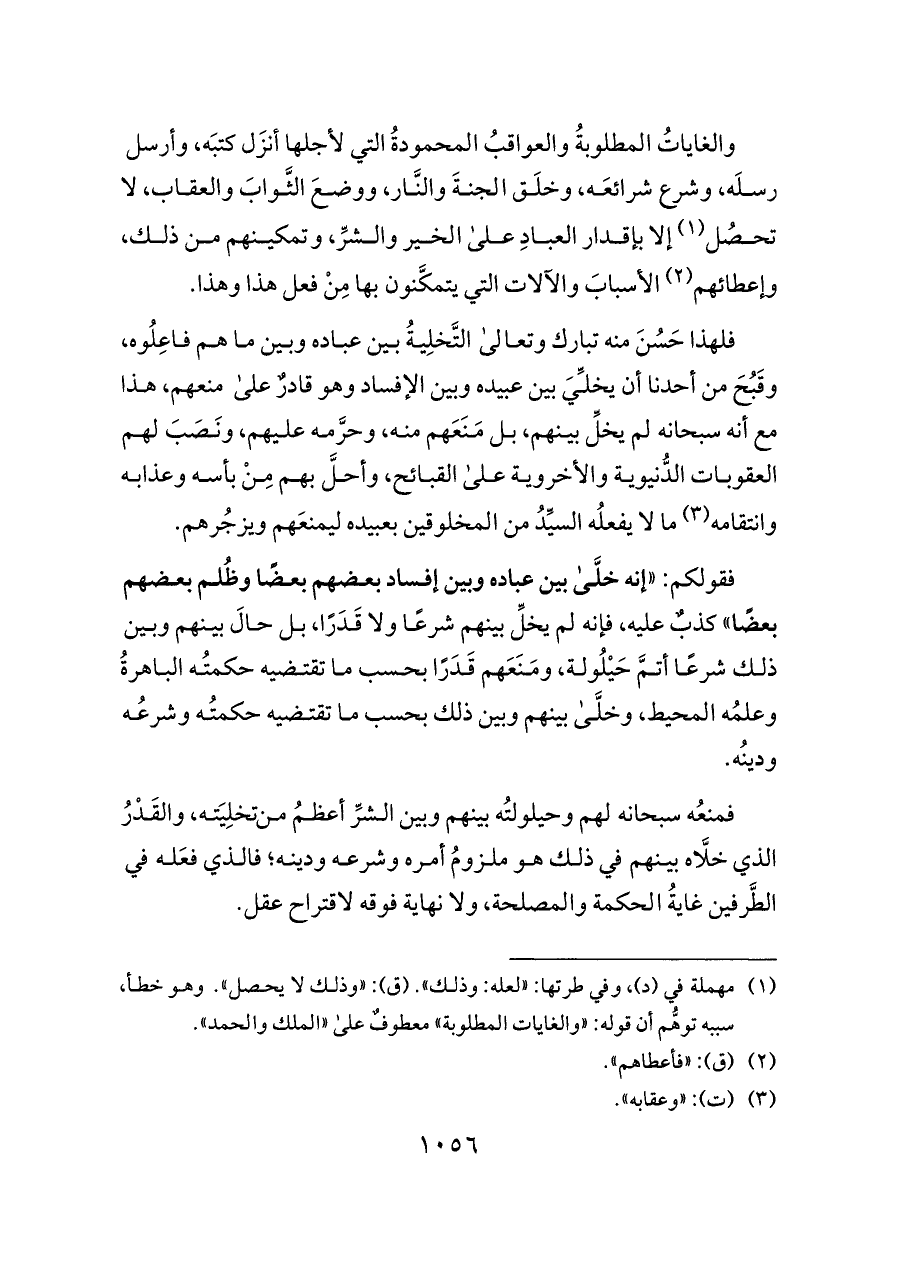 فلهذا حَسُنَ منه تبارك وتعالى التَّخلِيةُ بين عباده وبين ما هم فاعِلُوه، وقَبُحَ من أحدنا أن يخلِّيَ بين عبيده وبين الإفساد وهو قادرٌ على منعهم، هذا مع أنه سبحانه لم يخلِّ بينهم، بل مَنَعَهم منه، وحرَّمه عليهم، ونَصَبَ لهم العقوبات الدُّنيوية والأخروية على القبائح، وأحلَّ بهم مِنْ بأسه وعذابه وانتقامه (¬٣) ما لا يفعلُه السيِّدُ من المخلوقين بعبيده ليمنعَهم ويزجُرهم.