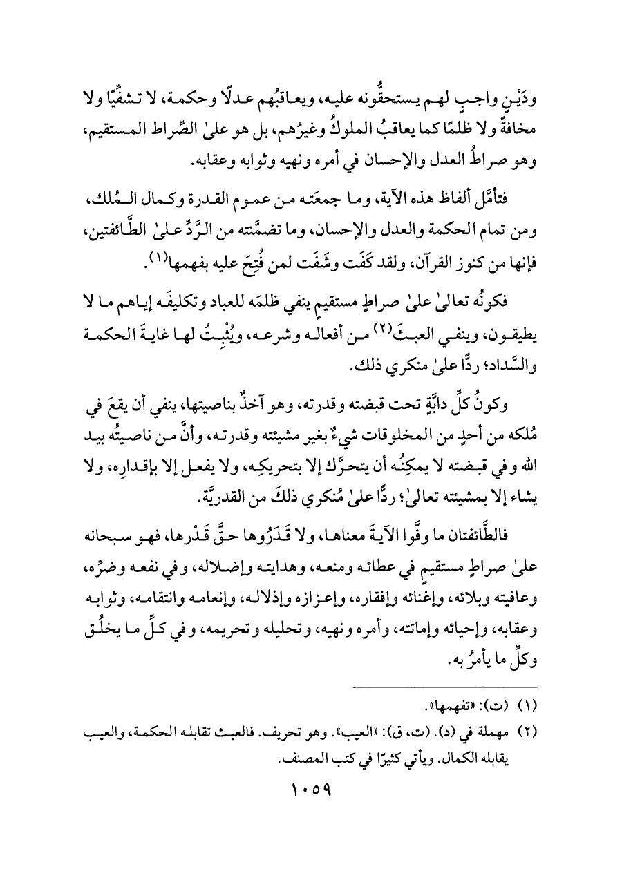 فالطَّائفتان ما وفَّوا الآيةَ معناها، ولا قَدَرُوها حقَّ قَدْرها، فهو سبحانه على صراطٍ مستقيمٍ في عطائه ومنعه، وهدايته وإضلاله، وفي نفعه وضرِّه، وعافيته وبلائه، وإغنائه وإفقاره، وإعزازه وإذلاله، وإنعامه وانتقامه، وثوابه وعقابه، وإحيائه وإماتته، وأمره ونهيه، وتحليله وتحريمه، وفي كلِّ ما يخلُق وكلِّ ما يأمرُ به.
