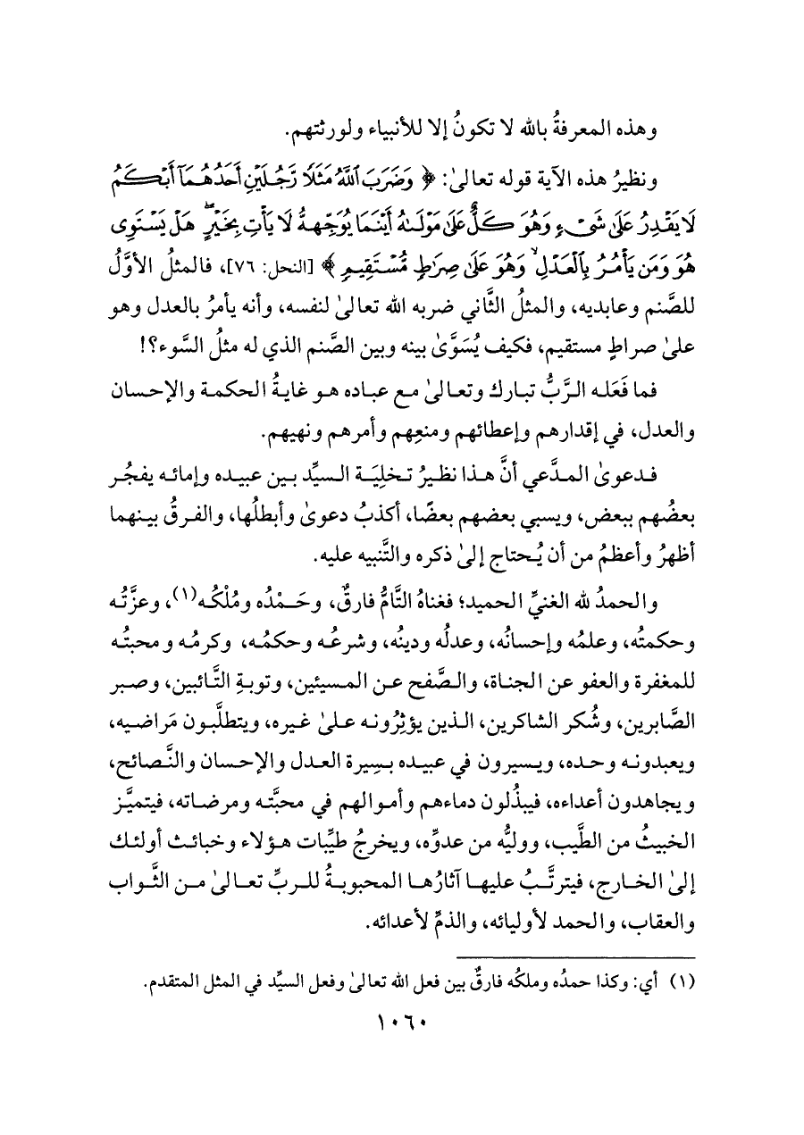 ونظيرُ هذه الآية قوله تعالى: {وَضَرَبَ اللَّهُ مَثَلًا رَجُلَيْنِ أَحَدُهُمَا أَبْكَمُ لَا يَقْدِرُ عَلَى شَيْءٍ وَهُوَ كَلٌّ عَلَى مَوْلَاهُ أَيْنَمَا يُوَجِّهْهُ لَا يَأْتِ بِخَيْرٍ هَلْ يَسْتَوِي هُوَ وَمَنْ يَأْمُرُ بِالْعَدْلِ وَهُوَ عَلَى صِرَاطٍ مُسْتَقِيمٍ} [النحل: ٧٦]، فالمثلُ الأوَّلُ للصَّنم وعابديه، والمثلُ الثَّاني ضربه الله تعالى لنفسه، وأنه يأمرُ بالعدل وهو على صراطٍ مستقيم، فكيف يُسَوَّى بينه وبين الصَّنم الذي له مثلُ السَّوء؟!