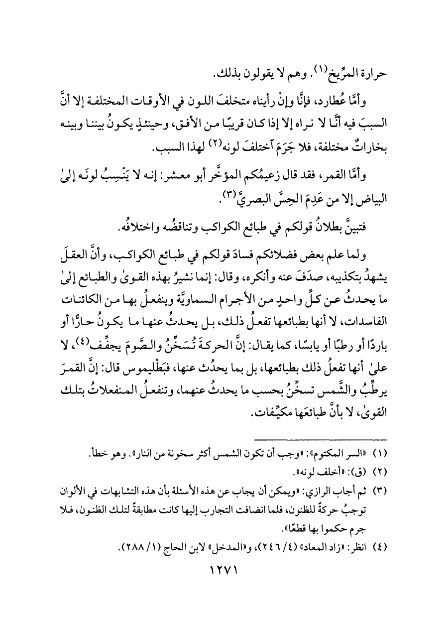 ولما علم بعض فضلائكم فسادَ قولكم في طبائع الكواكب، وأنَّ العقلَ يشهدُ بتكذيبه، صدَفَ عنه وأنكره، وقال: إنما نشيرُ بهذه القوى والطبائع إلى ما يحدثُ عن كلِّ واحدٍ من الأجرام السماويَّة وينفعلُ بها من الكائنات الفاسدات، لا أنها بطبائعها تفعلُ ذلك، بل يحدثُ عنها ما يكونُ حارًّا أو باردًا أو رطبًا أو يابسًا، كما يقال: إنَّ الحركةَ تُسَخِّنُ والصَّومَ يجفِّف (¬٤)، لا على أنها تفعلُ ذلك بطبائعها، بل بما يحدُث عنها، فبَطْليموس قال: إنَّ القمرَ يرطِّبُ والشَّمس تسخِّنُ بحسب ما يحدثُ عنهما، وتنفعلُ المنفعلاتُ بتلك القوى، لا بأنَّ طبائعَها مكيِّفات.