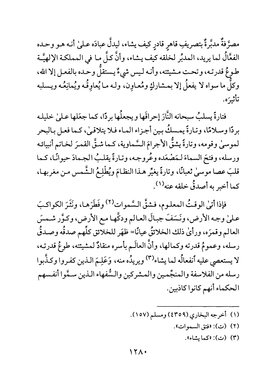 فتارةً يسلبُ سبحانه النَّارَ إحراقَها ويجعلُها بردًا، كما جعَلها على خليله بردًا وسلامًا، وتارةً يمسكُ بين أجزاء الماء فلا يتلاقى، كما فعل بالبحر لموسى وقومه، وتارةً يشقُّ الأجرامَ السَّماوية، كما شقَّ القمرَ لخاتم أنبيائه ورسله، وفتحَ السماءَ لمَصْعَده وعُروجه، وتارةً يقلبُ الجمادَ حيوانًا، كما قلبَ عصا موسى ثعبانًا، وتارةً يغيِّر هذا النظامَ ويُطْلِعُ الشَّمس من مغربها، كما أخبر به أصدقُ خلقه عنه (¬١).