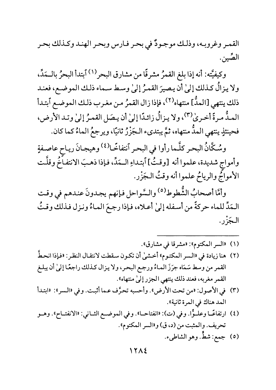 (¬٢) هنا زيادة في «السر المكتوم» أخشى أن تكون سقطت لانتقال النظر: «فإذا انحطَّ القمر من وسط سَمَاه جرَزَ الماءُ ورجع البحر، ولا يزال كذلك راجعًا إلى أن يبلغ القمر مغربه، فعند ذلك ينتهي الجزر إلى منتهاه».