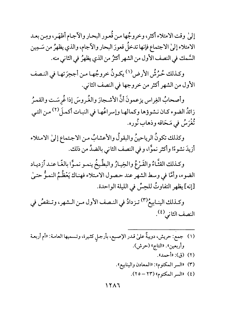 إلى وقت الامتلاء أكثر، وخروجُها من قُعور البحار والآجام أظهَر، ومِن بعد الامتلاء إلى الاجتماع فإنها تدخلُ قعورَ البحار والآجام، والذي يظهرُ من سَمِين السَّمك في النصف الأول من الشهر أكثرُ من الذي يظهرُ في الثاني منه.