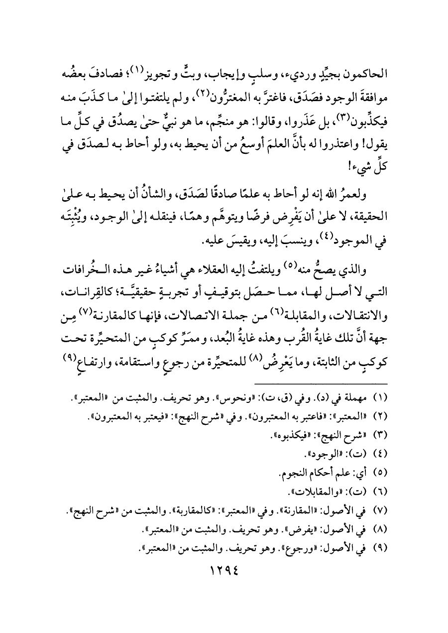 الحاكمون بجيِّدٍ ورديء، وسلبٍ وإيجاب، وبتٍّ وتجويز (¬١)؛ فصادفَ بعضُه موافقةَ الوجود فصَدَق، فاغترَّ به المغترُّون (¬٢)، ولم يلتفتوا إلى ما كذَبَ منه فيكذِّبون (¬٣)، بل عَذَروا، وقالوا: هو منجِّم، ما هو نبيٌّ حتى يصدُق في كلِّ ما يقول! واعتذروا له بأنَّ العلمَ أوسعُ من أن يحيط به، ولو أحاط به لصدَق في كلِّ شيء!