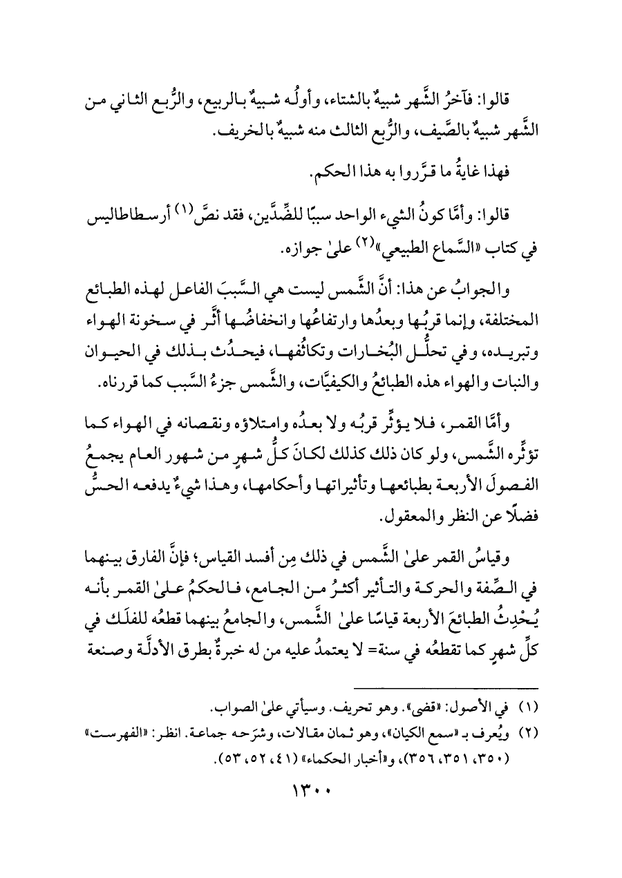 وقياسُ القمر على الشَّمس في ذلك مِن أفسد القياس؛ فإنَّ الفارق بينهما في الصِّفة والحركة والتأثير أكثرُ من الجامع، فالحكمُ على القمر بأنه يُحْدِثُ الطبائعَ الأربعة قياسًا على الشَّمس، والجامعُ بينهما قطعُه للفلَك في كلِّ شهرٍ كما تقطعُه في سنة= لا يعتمدُ عليه من له خبرةٌ بطرق الأدلَّة وصنعة