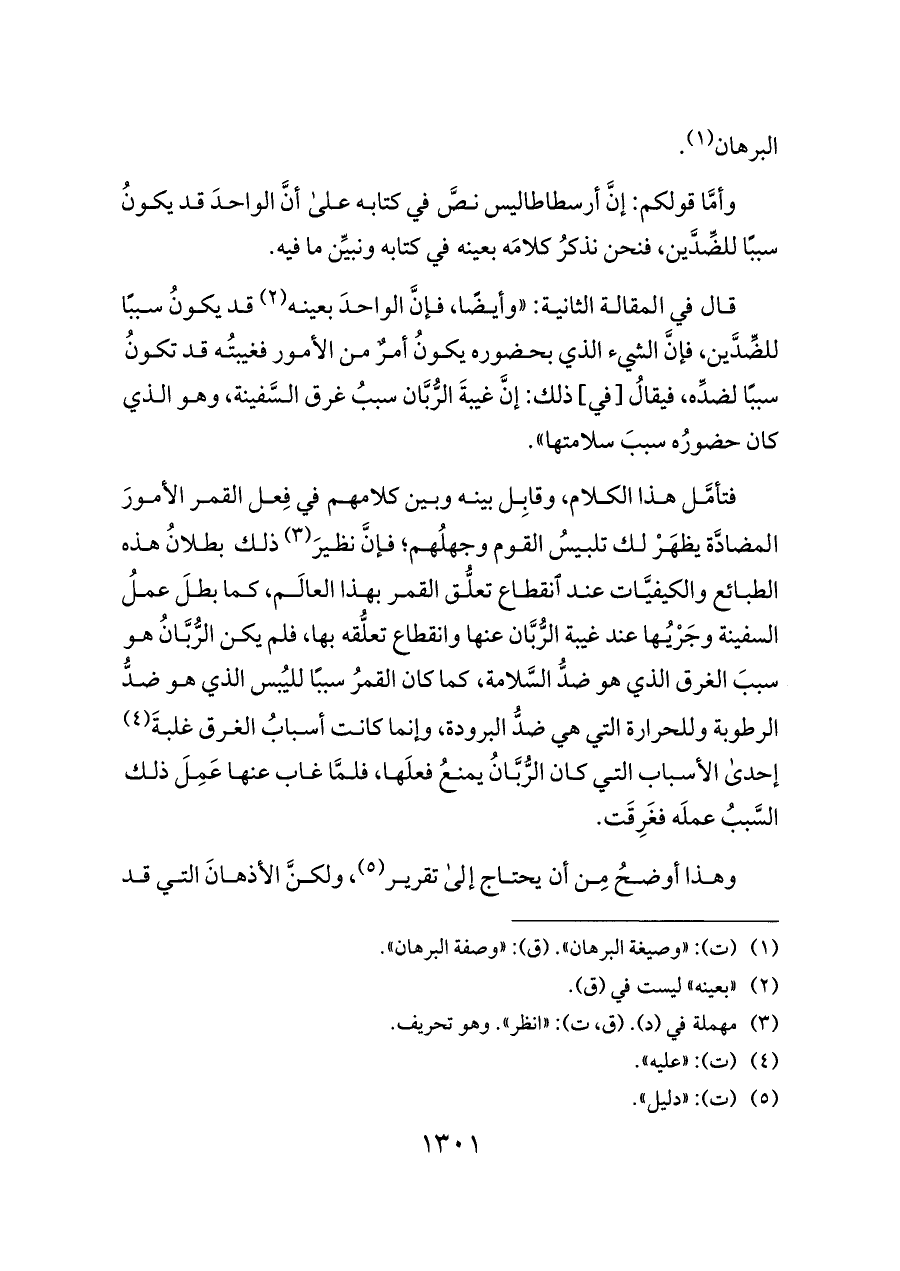 قال في المقالة الثانية: «وأيضًا، فإنَّ الواحدَ بعينه (¬٢) قد يكونُ سببًا للضِّدَّين، فإنَّ الشيء الذي بحضوره يكونُ أمرٌ من الأمور فغيبتُه قد تكونُ سببًا لضدِّه، فيقالُ [في] ذلك: إنَّ غيبةَ الرُّبَّان سببُ غرق السَّفينة، وهو الذي كان حضورُه سببَ سلامتها».