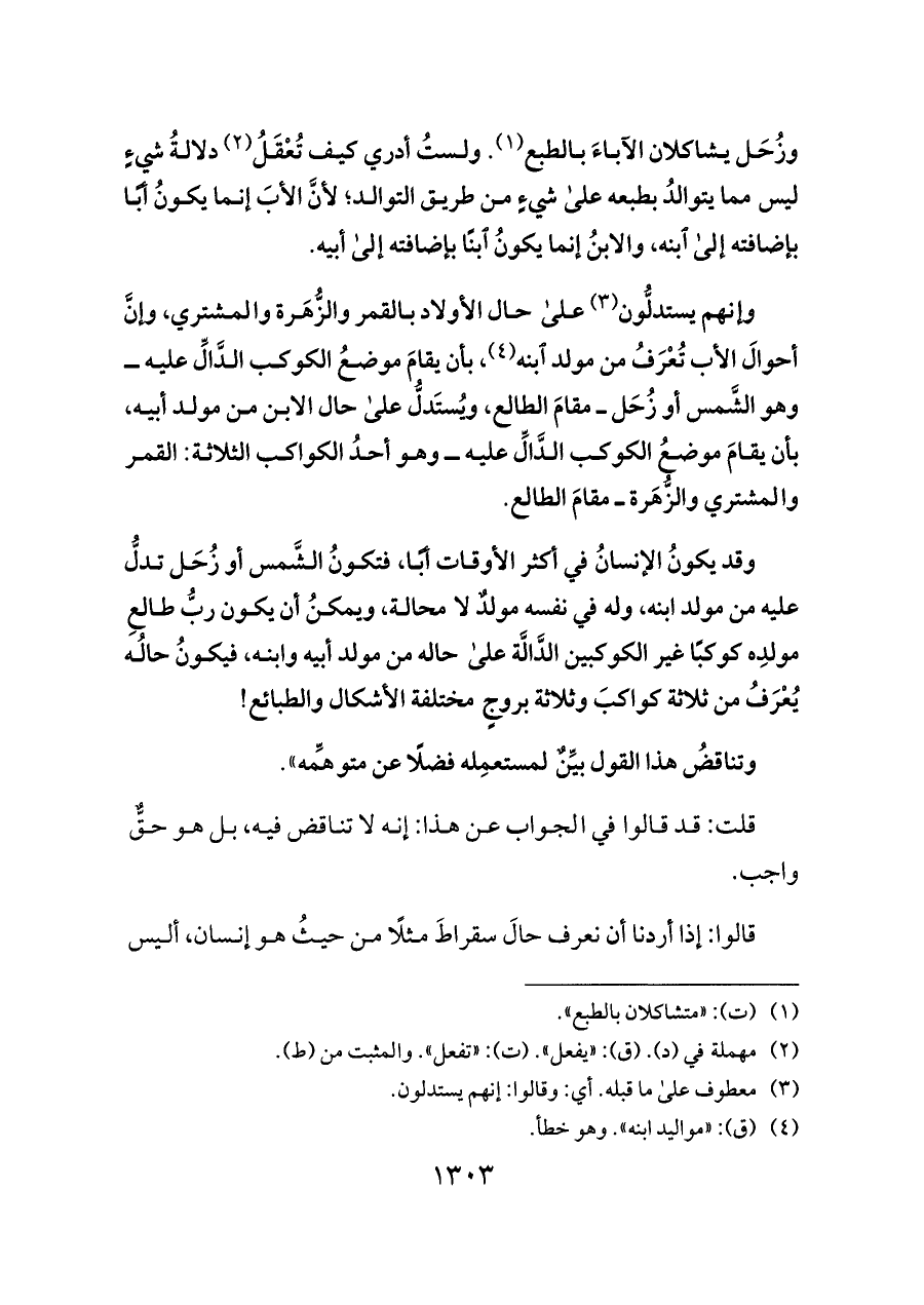 وزُحَل يشاكلان الآباءَ بالطبع (¬١). ولستُ أدري كيف تُعْقَلُ (¬٢) دلالةُ شيءٍ ليس مما يتوالدُ بطبعه على شيءٍ من طريق التوالد؛ لأنَّ الأبَ إنما يكونُ أبًا بإضافته إلى ابنه، والابنُ إنما يكونُ ابنًا بإضافته إلى أبيه.
