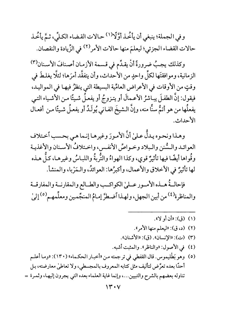 وكذلك يجبُ ضرورةً أنْ يقدِّم في قسمة الأزمان أصنافَ الأسنان (¬٣) الزمانية، وموافقتَها لكلِّ واحدٍ من الأحداث، وأن يتفقَّد أمرَها؛ لئلَّا يغلطَ في وقتٍ من الأوقات في الأعراض العامِّية البسيطة التي ينظرُ فيها في المواليد، فيقول: إنَّ الطفلَ يباشرُ الأعمالَ أو يتزوجُ أو يفعلُ شيئًا من الأشياء التي يفعلُها من هو أتمُّ سنًّا منه، وإنَّ الشيخَ الفاني يُولَدُ أو يفعلُ شيئًا من أفعال الأحداث.