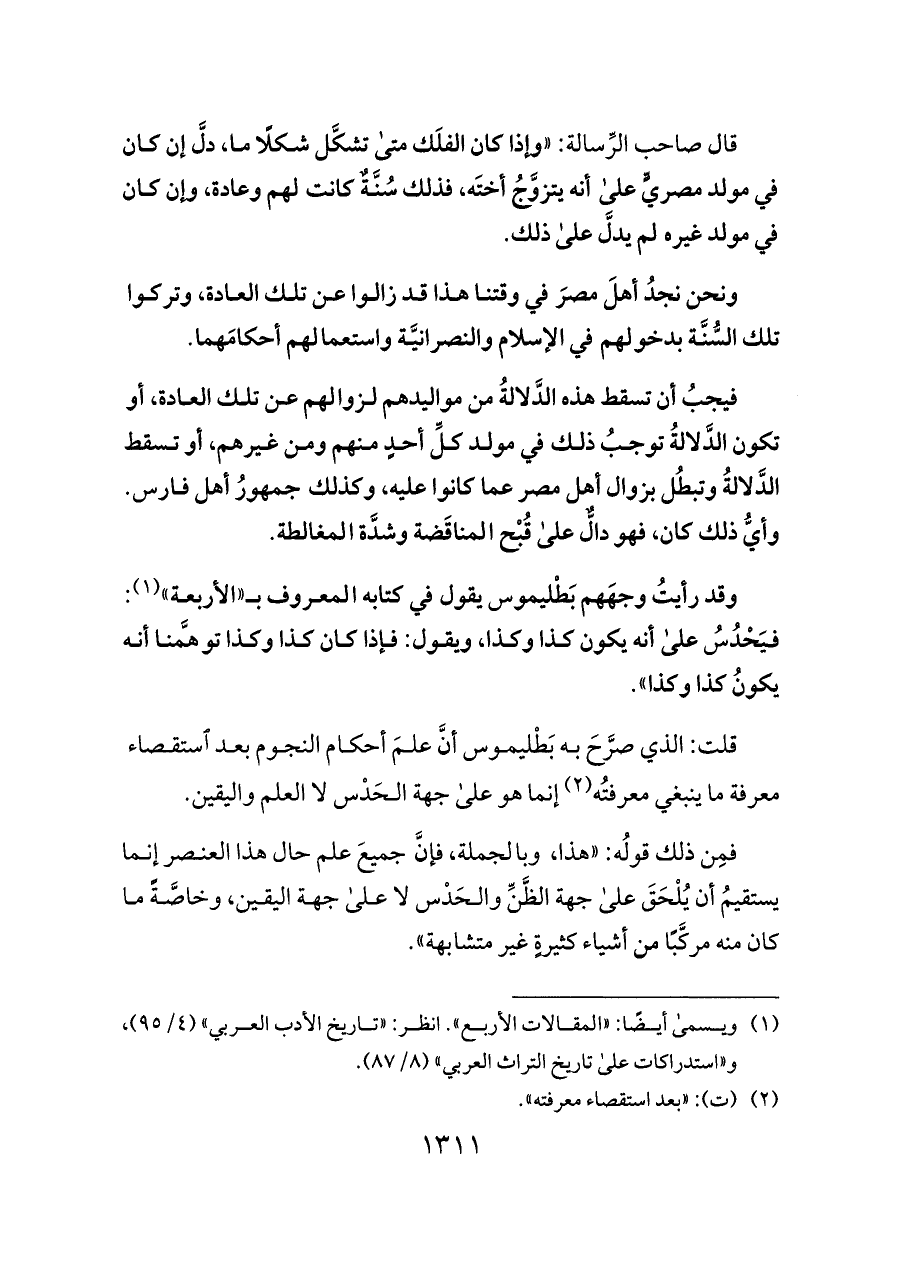 وقد رأيتُ وجهَهم بَطْليموس يقول في كتابه المعروف بـ «الأربعة» (¬١): فيَحْدُسُ على أنه يكون كذا وكذا، ويقول: فإذا كان كذا وكذا توهَّمنا أنه يكونُ كذا وكذا».