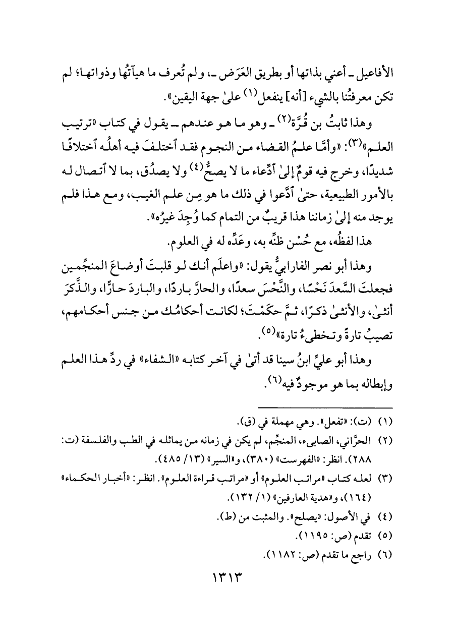 وهذا ثابتُ بن قُرَّة (¬٢) ــ وهو ما هو عندهم ــ يقول في كتاب «ترتيب العلم» (¬٣): «وأمَّا علمُ القضاء من النجوم فقد اختلفَ فيه أهلُه اختلافًا شديدًا، وخرج فيه قومٌ إلى ادِّعاء ما لا يصحُّ (¬٤) ولا يصدُق، بما لا اتصال له بالأمور الطبيعية، حتى ادَّعوا في ذلك ما هو مِن علم الغيب، ومع هذا فلم يوجد منه إلى زماننا هذا قريبٌ من التمام كما وُجِدَ غيرُه».