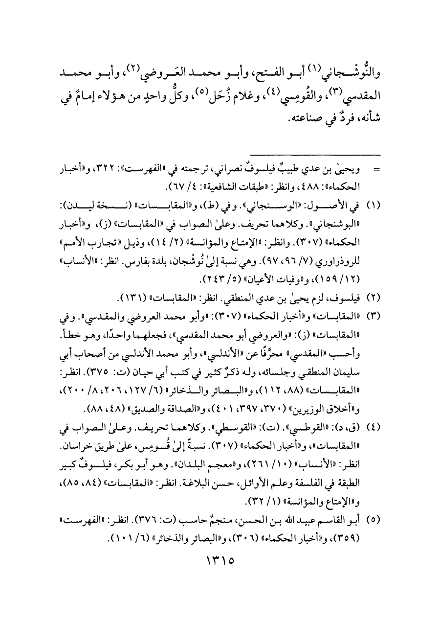 (¬٣) «المقابسات» و «أخبار الحكماء» (٣٠٧): «وأبو محمد العروضي والمقدسي». وفي «المقابسات» (ز): «والعروضي أبو محمد المقدسي»، فجعلهما واحدًا، وهو خطأ. وأحسب «المقدسي» محرَّفًا عن «الأندلسي»، وأبو محمد الأندلسي من أصحاب أبي سليمان المنطقي وجلسائه، وله ذكرٌ كثير في كتب أبي حيان (ت: ٣٧٥). انظر: «المقابسات» (٨٨، ١١٢)، و «البصائر والذخائر» (٦/ ١٢٧، ٢٠٦، ٨/ ٢٠٠)، و «أخلاق الوزيرين» (٣٧٠، ٣٩٧، ٤٠١)، و «الصداقة والصديق» (٤٨، ٨٨) ..